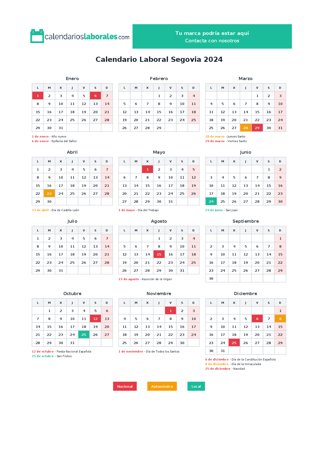 El calendario laboral de Segovia en 2024 cuenta con un total de 14 días festivos, que incluyen festivos nacionales, festivos autonómicos de Castilla León y los festivos locales establecidos por cada municipio.