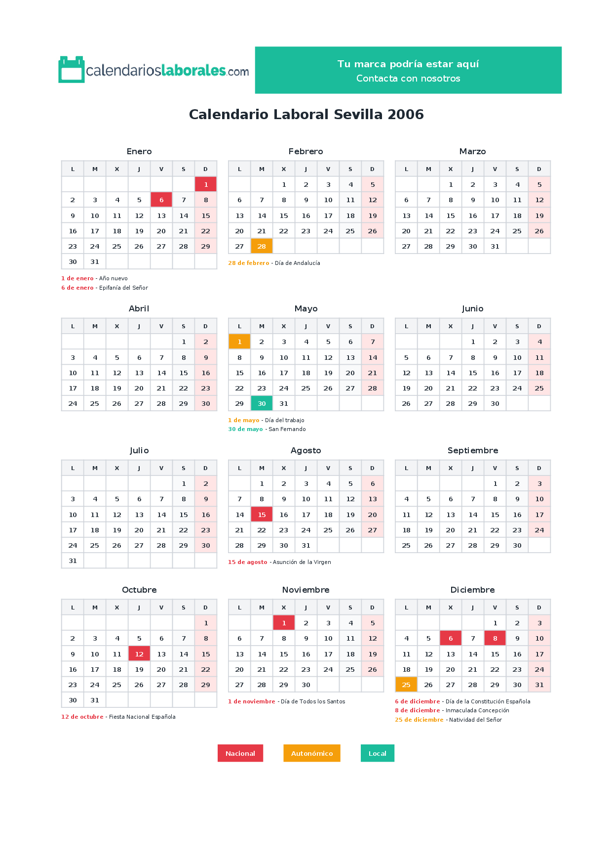 El calendario laboral de Sevilla en 2006 cuenta con un total de 11 días festivos, que incluyen festivos nacionales, festivos autonómicos de Andalucía y los festivos locales establecidos por cada municipio.