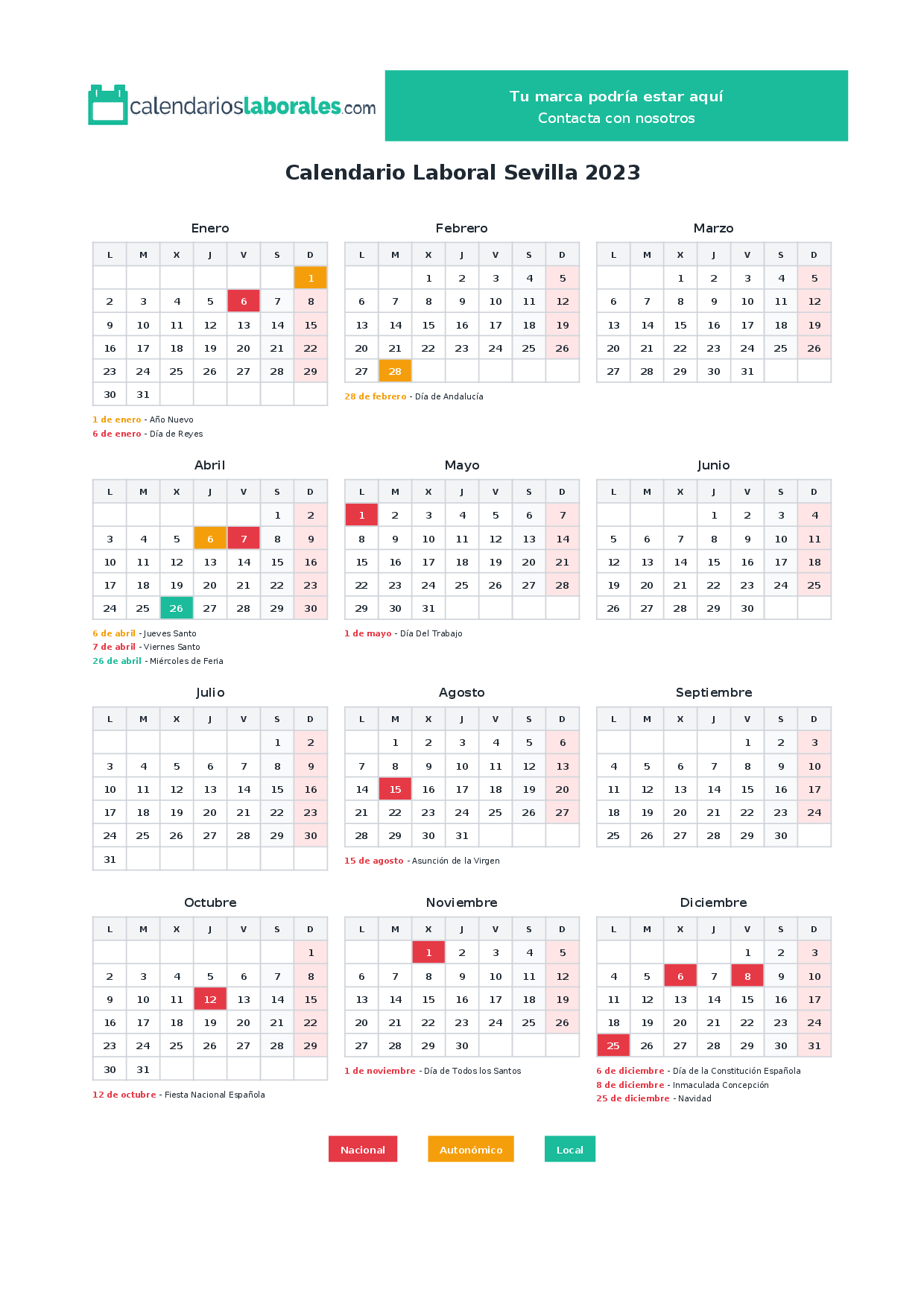 El calendario laboral de Sevilla en 2023 cuenta con un total de 13 días festivos, que incluyen festivos nacionales, festivos autonómicos de Andalucía y los festivos locales establecidos por cada municipio.