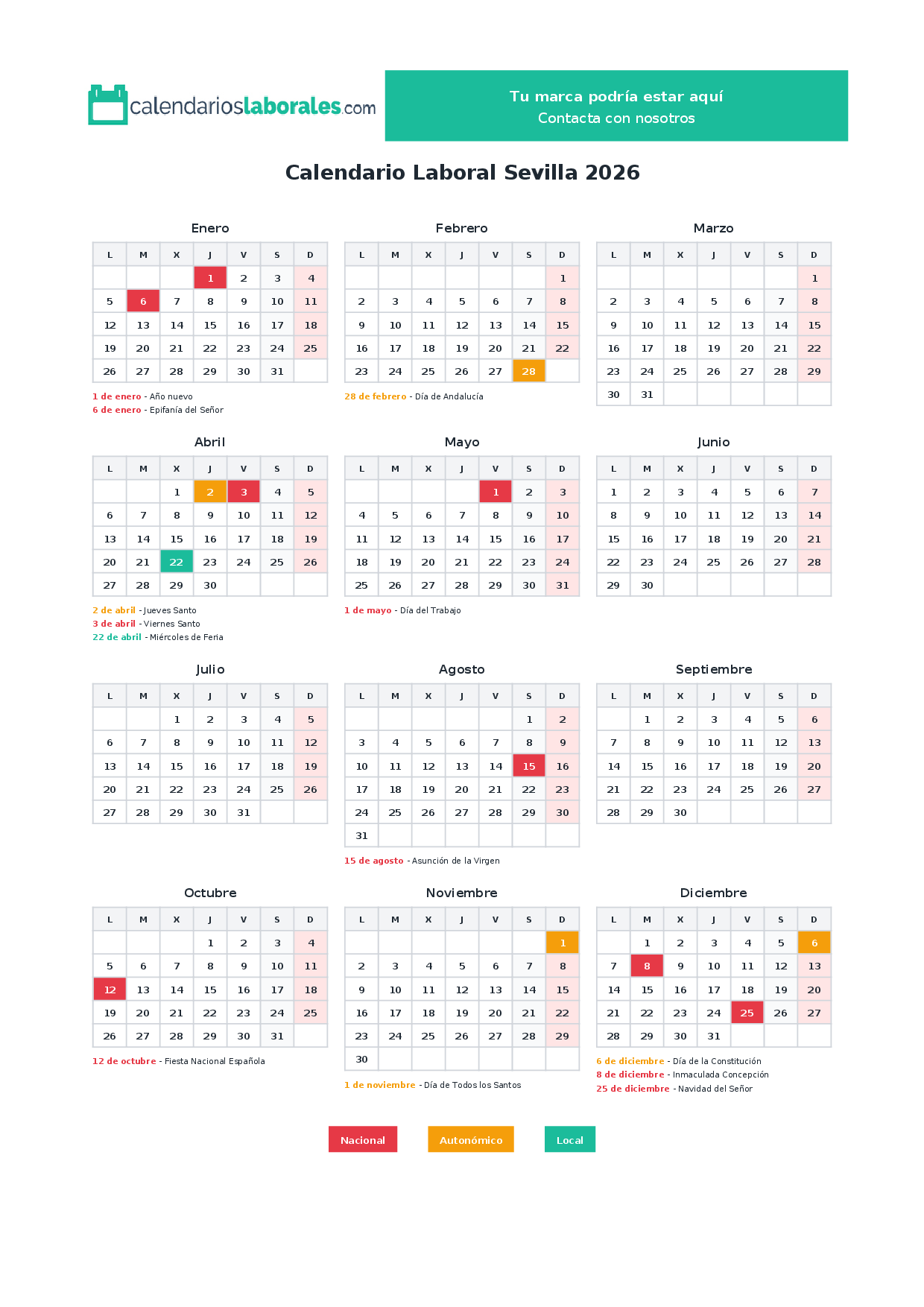 El calendario laboral de Sevilla en 2026 cuenta con un total de 13 días festivos, que incluyen festivos nacionales, festivos autonómicos de Andalucía y los festivos locales establecidos por cada municipio.