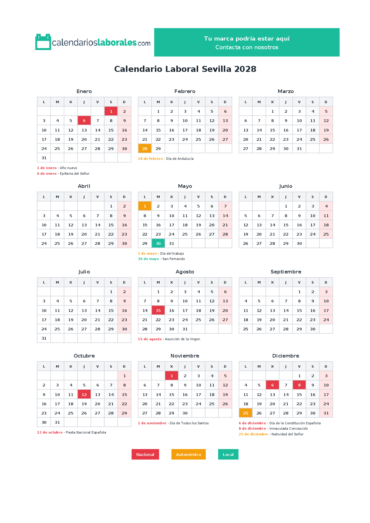 El calendario laboral de Sevilla en 2028 cuenta con un total de 11 días festivos, que incluyen festivos nacionales, festivos autonómicos de Andalucía y los festivos locales establecidos por cada municipio.