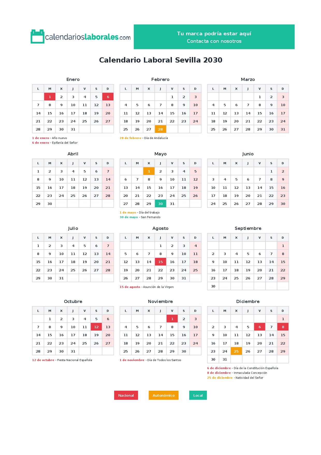 El calendario laboral de Sevilla en 2030 cuenta con un total de 11 días festivos, que incluyen festivos nacionales, festivos autonómicos de Andalucía y los festivos locales establecidos por cada municipio.