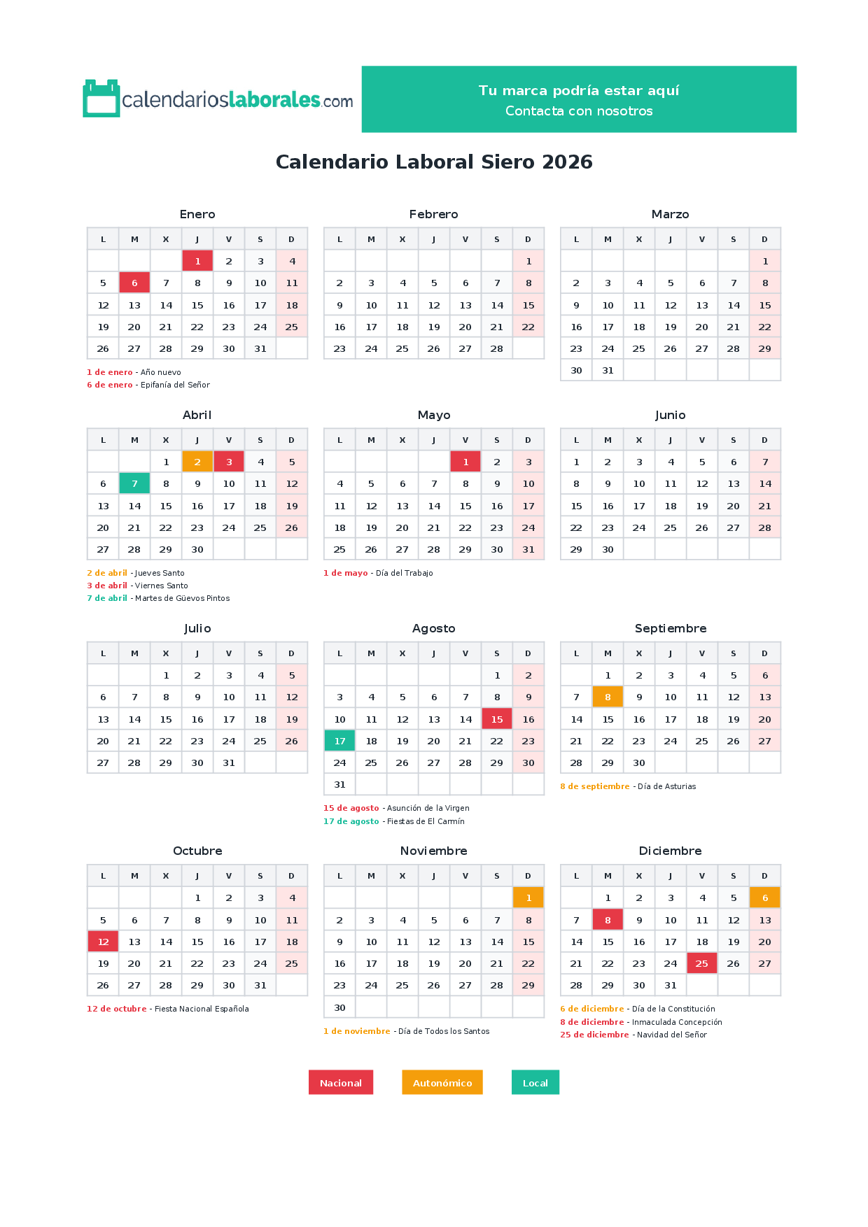 Además, el Ayuntamiento de Siero fija 2 festivos locales que completan el calendario laboral del municipio.