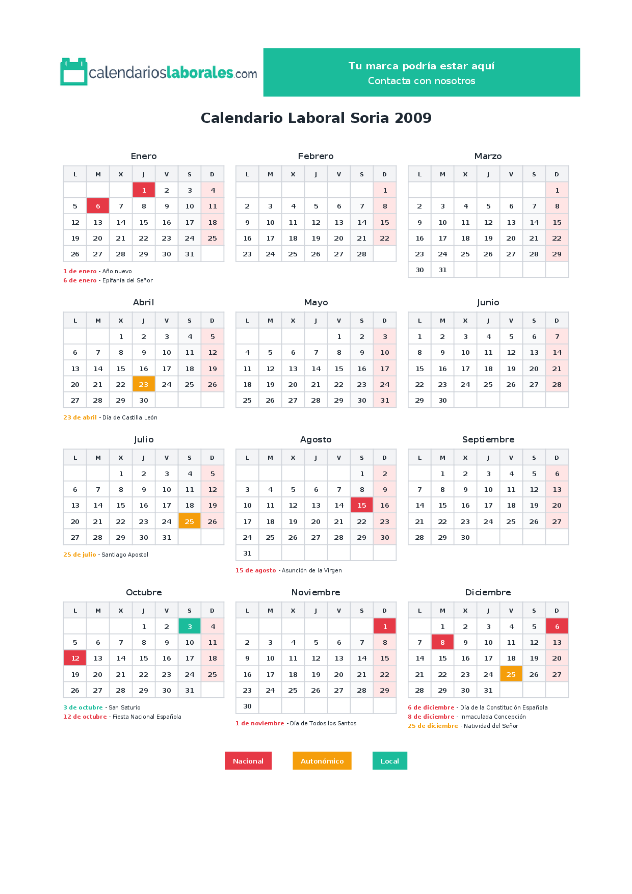 El calendario laboral de Soria en 2009 cuenta con un total de 11 días festivos, que incluyen festivos nacionales, festivos autonómicos de Castilla León y los festivos locales establecidos por cada municipio.