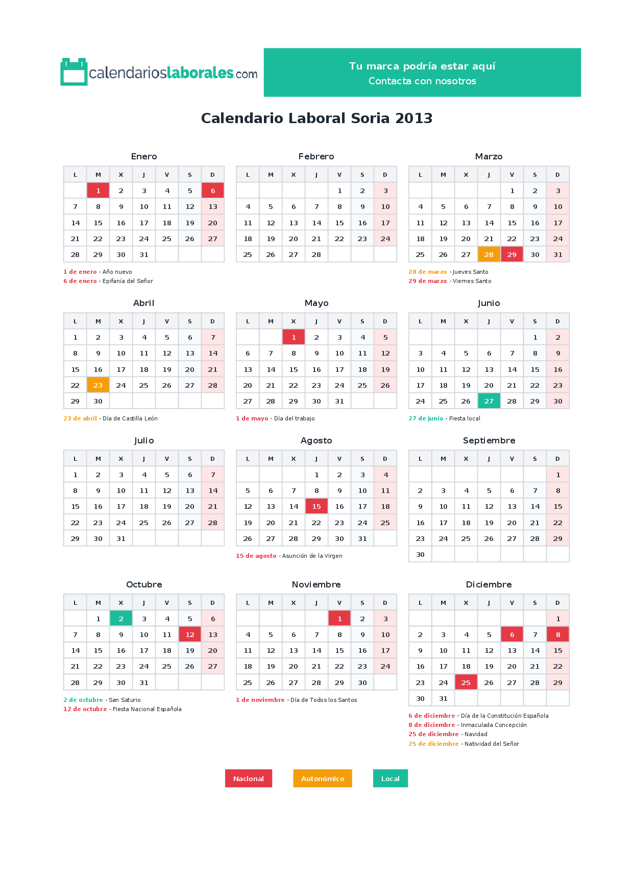 Festivos nacionales en Soria 2013