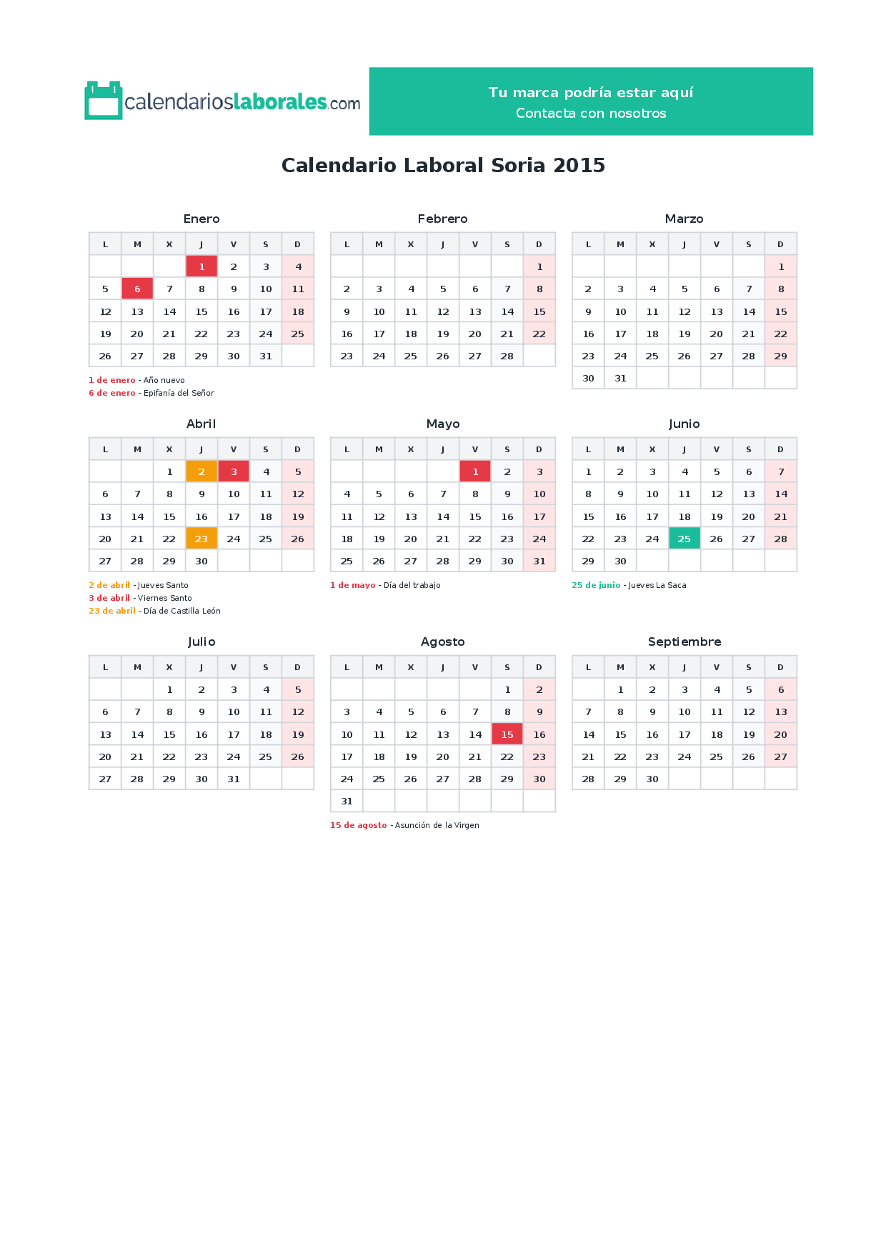 El calendario laboral de Soria en 2015 cuenta con un total de 14 días festivos, que incluyen festivos nacionales, festivos autonómicos de Castilla León y los festivos locales establecidos por cada municipio.