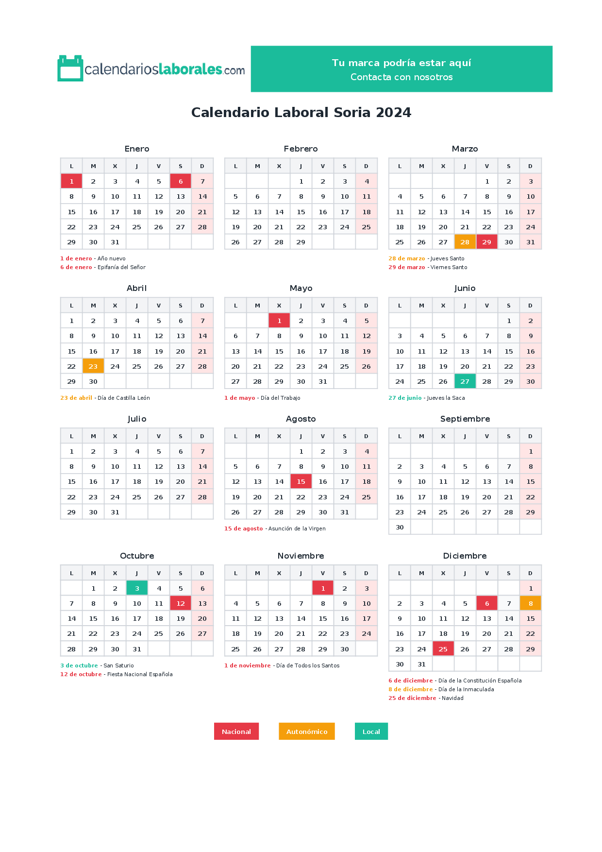 El calendario laboral de Soria en 2024 cuenta con un total de 14 días festivos, que incluyen festivos nacionales, festivos autonómicos de Castilla León y los festivos locales establecidos por cada municipio.