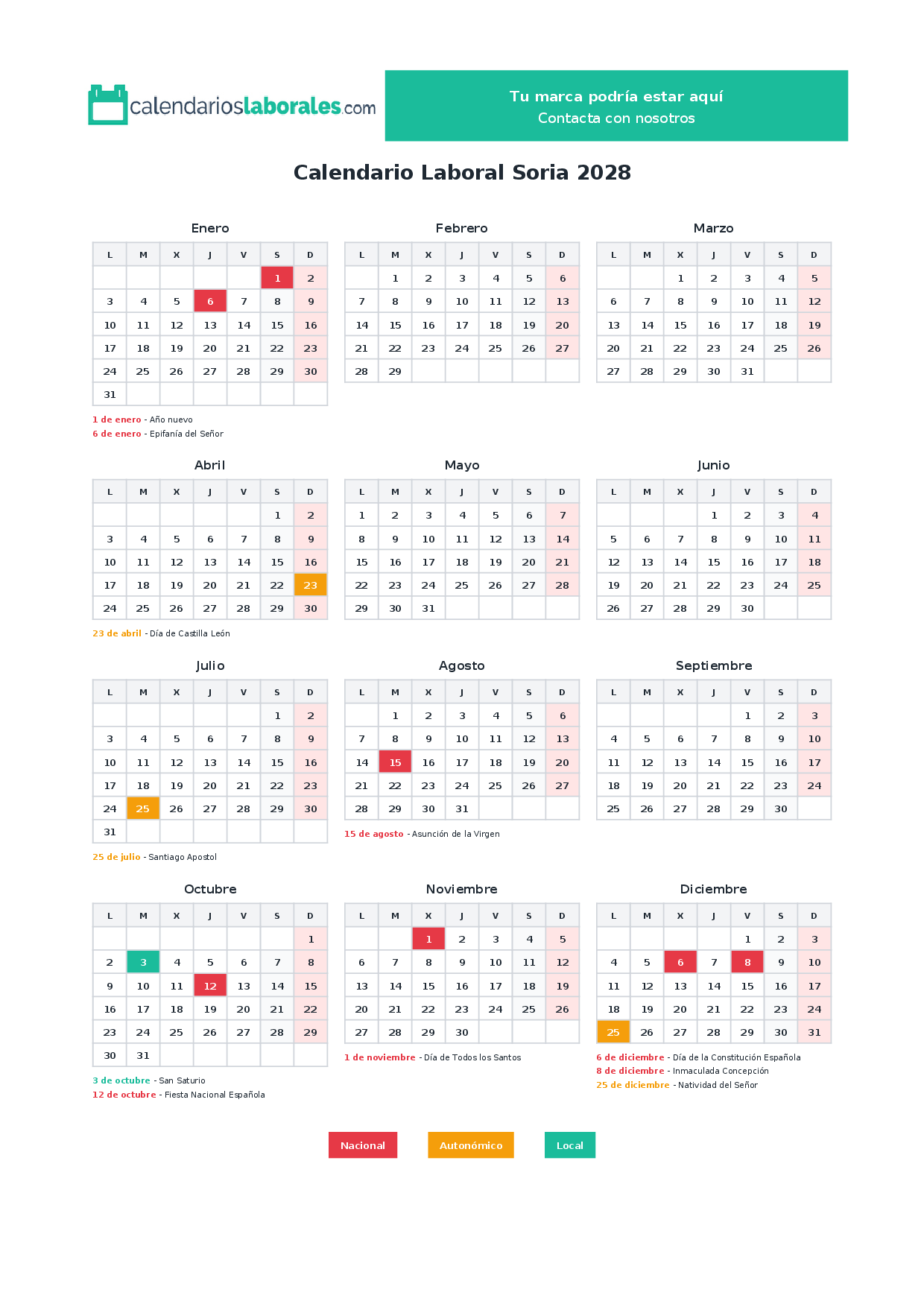 El calendario laboral de Soria en 2028 cuenta con un total de 11 días festivos, que incluyen festivos nacionales, festivos autonómicos de Castilla León y los festivos locales establecidos por cada municipio.