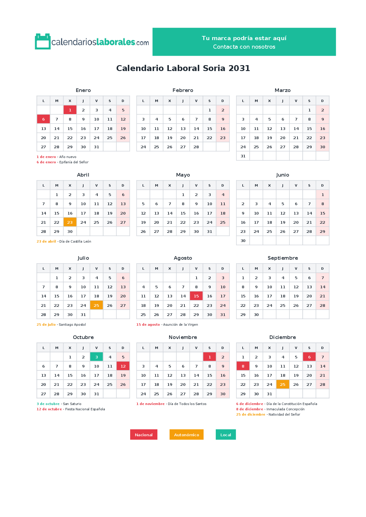 El calendario laboral de Soria en 2031 cuenta con un total de 11 días festivos, que incluyen festivos nacionales, festivos autonómicos de Castilla León y los festivos locales establecidos por cada municipio.