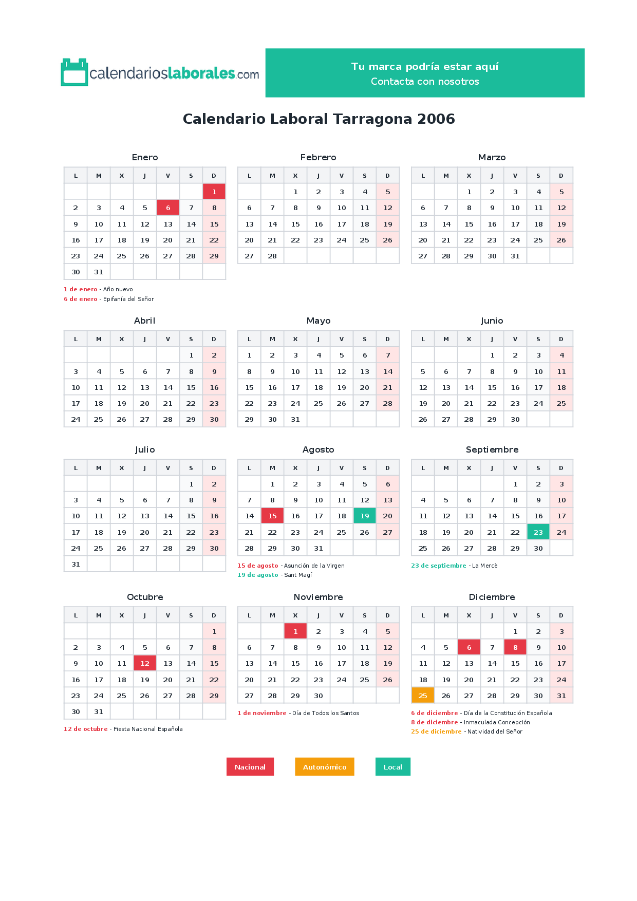 El calendario laboral de Tarragona en 2006 cuenta con un total de 10 días festivos, que incluyen festivos nacionales, festivos autonómicos de Cataluña y los festivos locales establecidos por cada municipio.