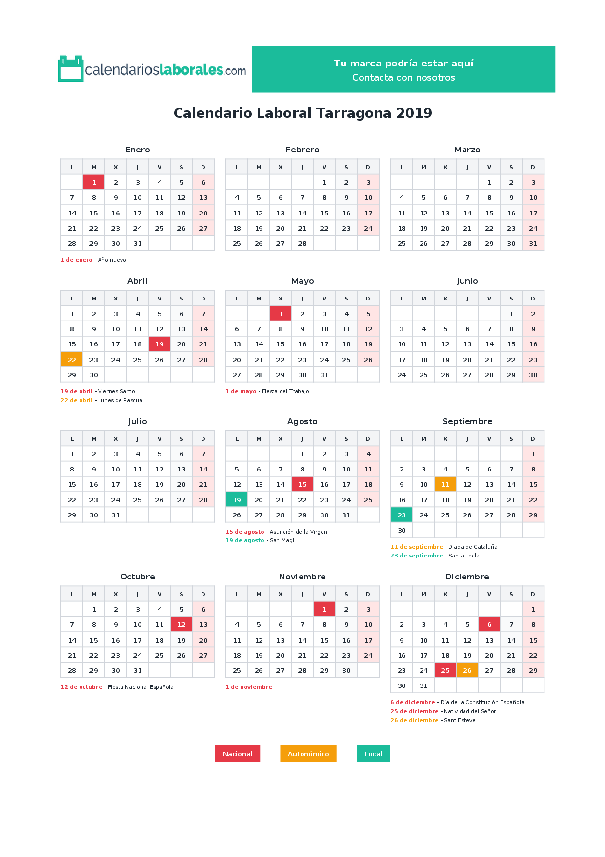 El calendario laboral de Tarragona en 2019 cuenta con un total de 13 días festivos, que incluyen festivos nacionales, festivos autonómicos de Cataluña y los festivos locales establecidos por cada municipio.