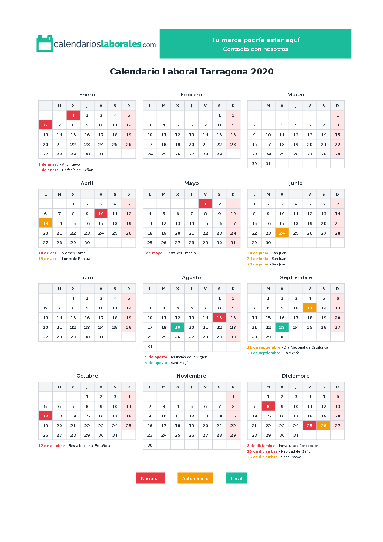 El calendario laboral de Tarragona en 2020 cuenta con un total de 14 días festivos, que incluyen festivos nacionales, festivos autonómicos de Cataluña y los festivos locales establecidos por cada municipio.
