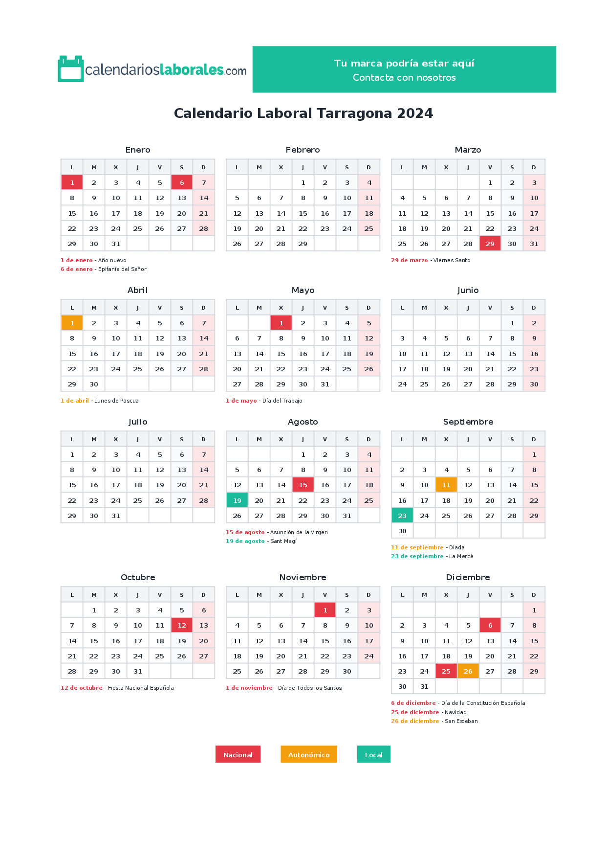 El calendario laboral de Tarragona en 2024 cuenta con un total de 14 días festivos, que incluyen festivos nacionales, festivos autonómicos de Cataluña y los festivos locales establecidos por cada municipio.