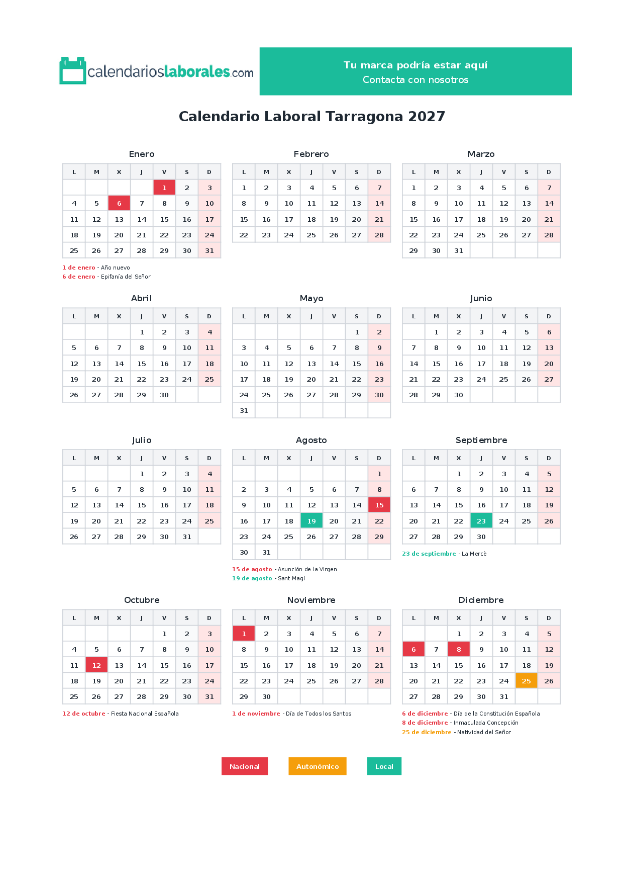 El calendario laboral de Tarragona en 2027 cuenta con un total de 10 días festivos, que incluyen festivos nacionales, festivos autonómicos de Cataluña y los festivos locales establecidos por cada municipio.