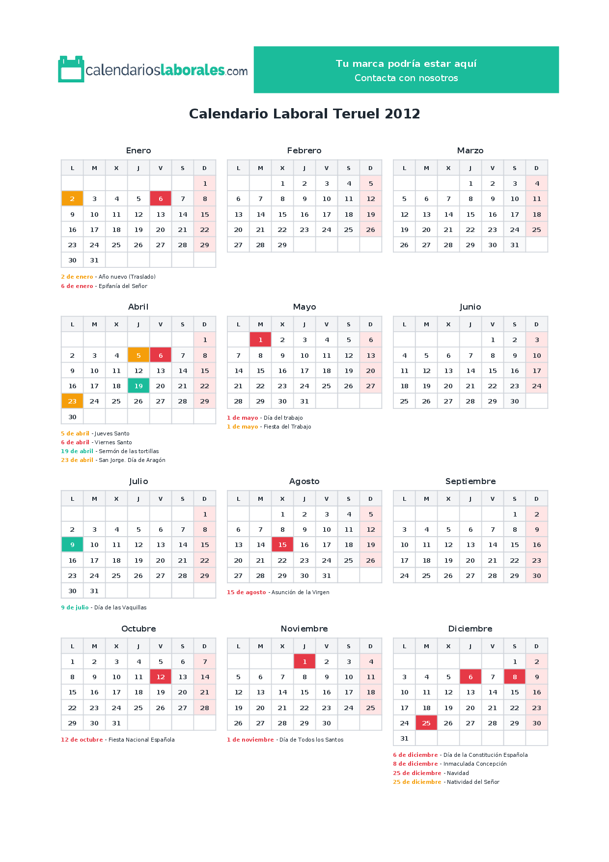 El calendario laboral de Teruel en 2012 cuenta con un total de 14 días festivos, que incluyen festivos nacionales, festivos autonómicos de Aragón y los festivos locales establecidos por cada municipio.