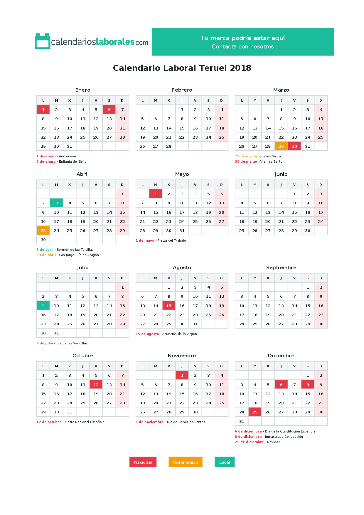 El calendario laboral de Teruel en 2018 cuenta con un total de 14 días festivos, que incluyen festivos nacionales, festivos autonómicos de Aragón y los festivos locales establecidos por cada municipio.