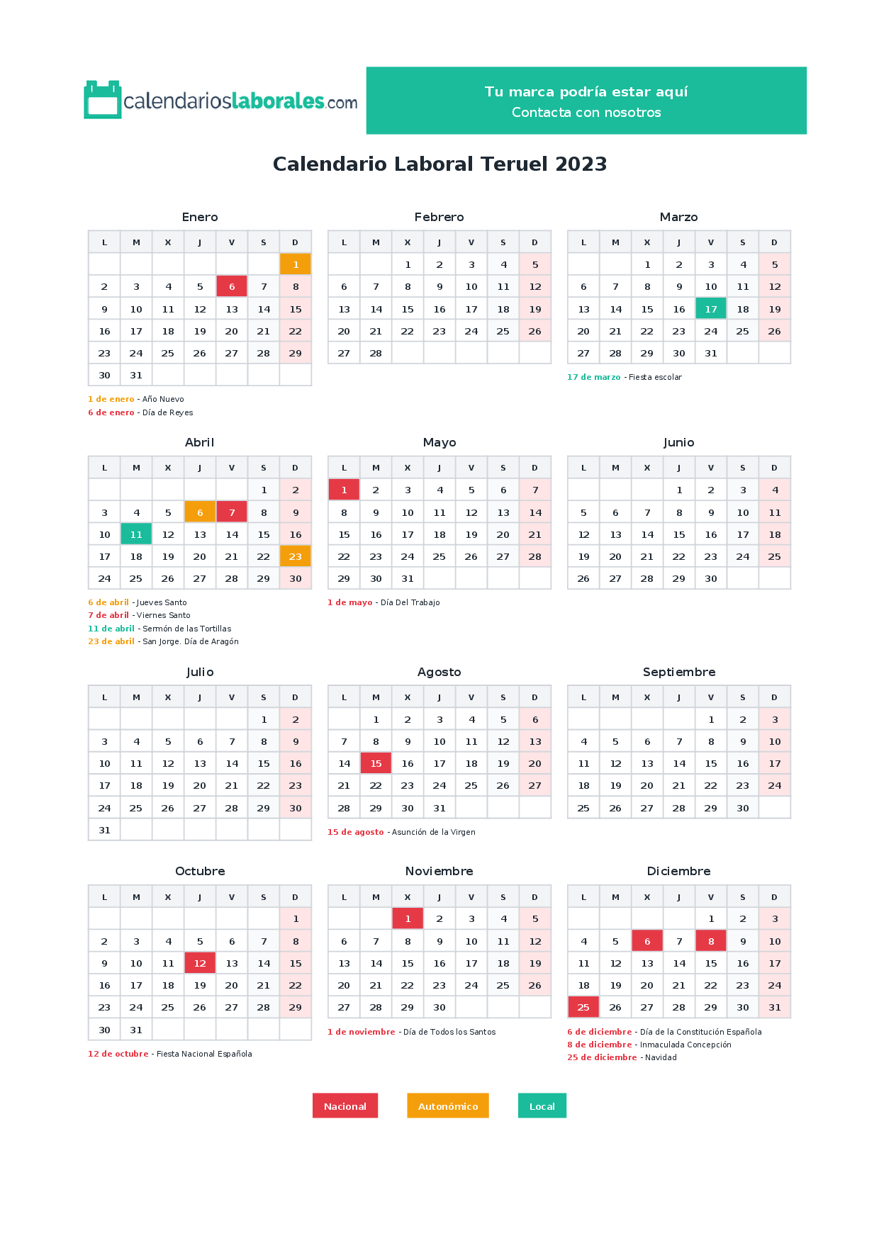 Calendario laboral Teruel 2023