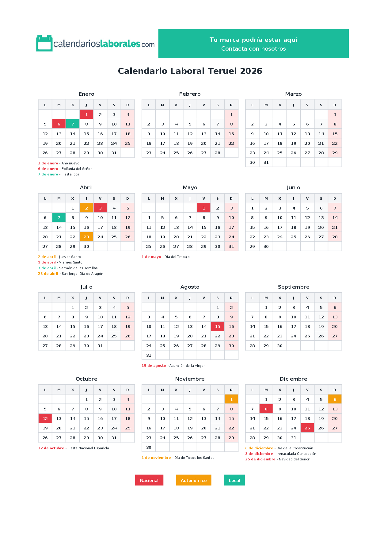 El calendario laboral de Teruel en 2026 cuenta con un total de 14 días festivos, que incluyen festivos nacionales, festivos autonómicos de Aragón y los festivos locales establecidos por cada municipio.