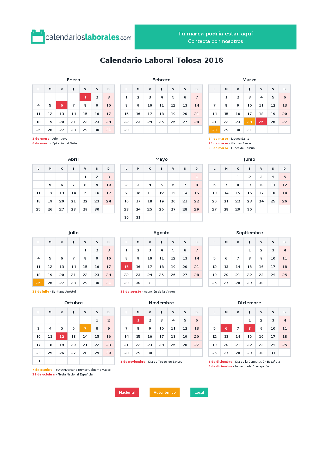 Calendario laboral Tolosa 2016
