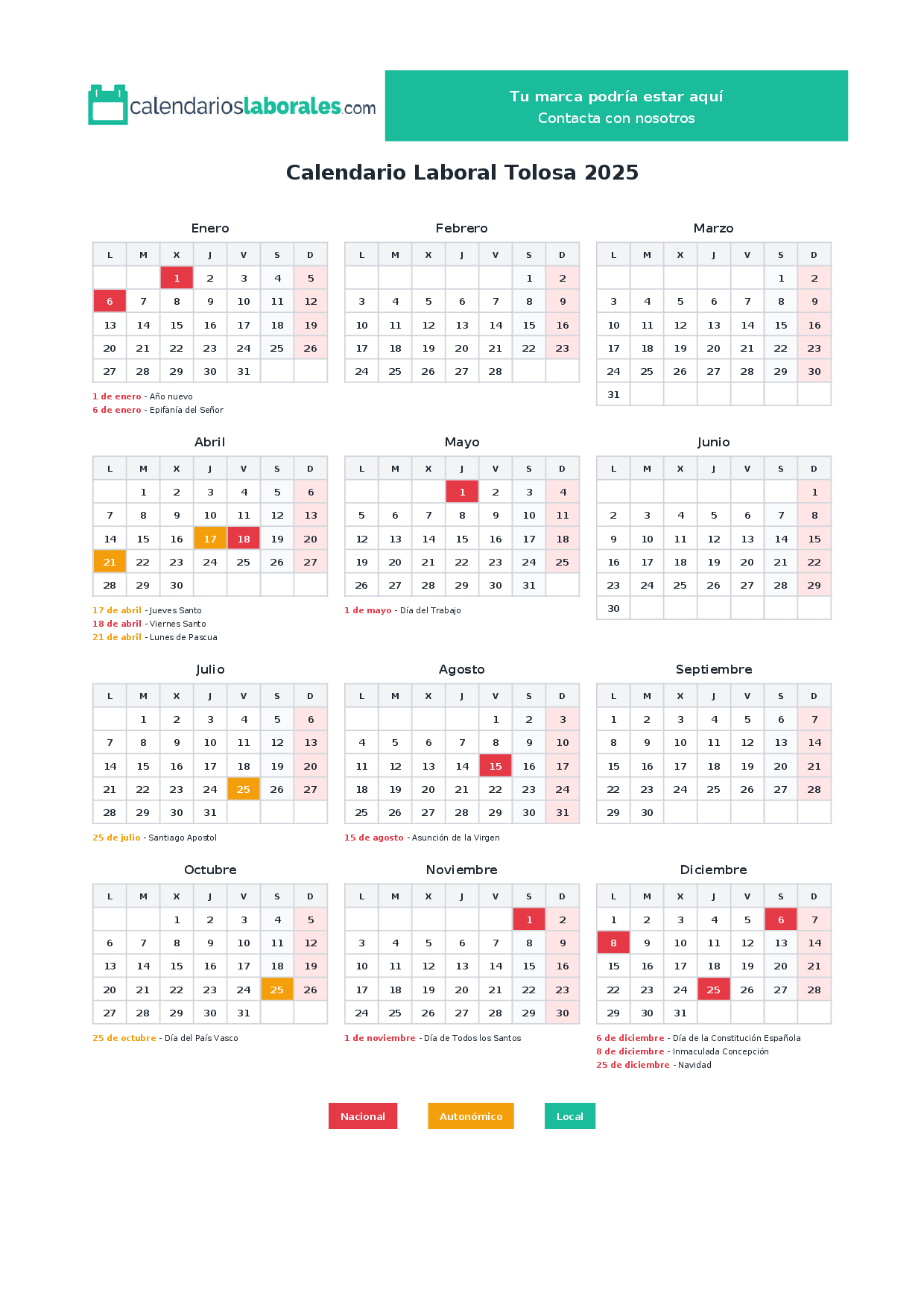 El calendario laboral de Tolosa en 2025 incluye un total de 13 días festivos, que combinan festivos nacionales, festivos autonómicos de País Vasco y los festivos locales propios del municipio.