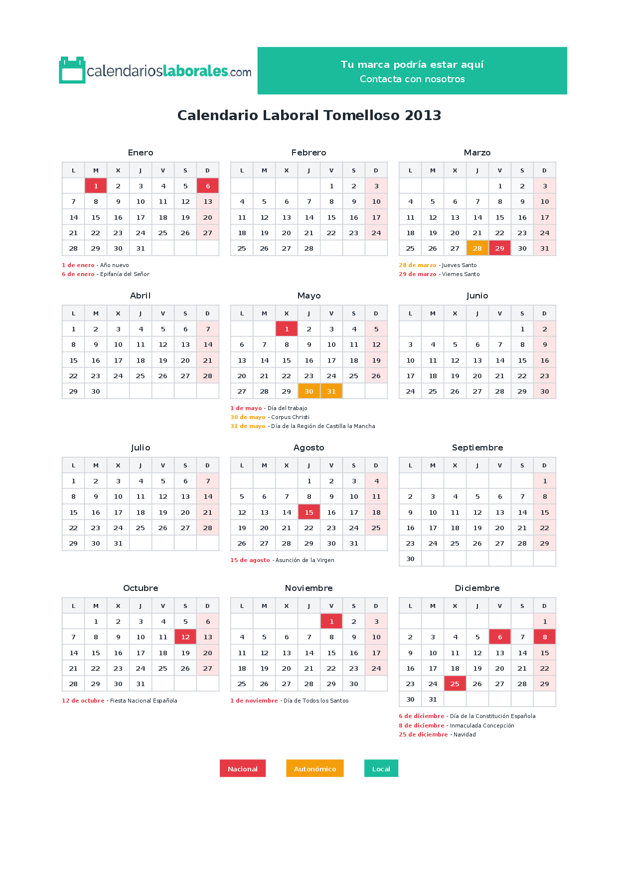 En 2013, 10 festivos nacionales se celebran en todo el territorio español, incluidos en el calendario laboral de Tomelloso.
