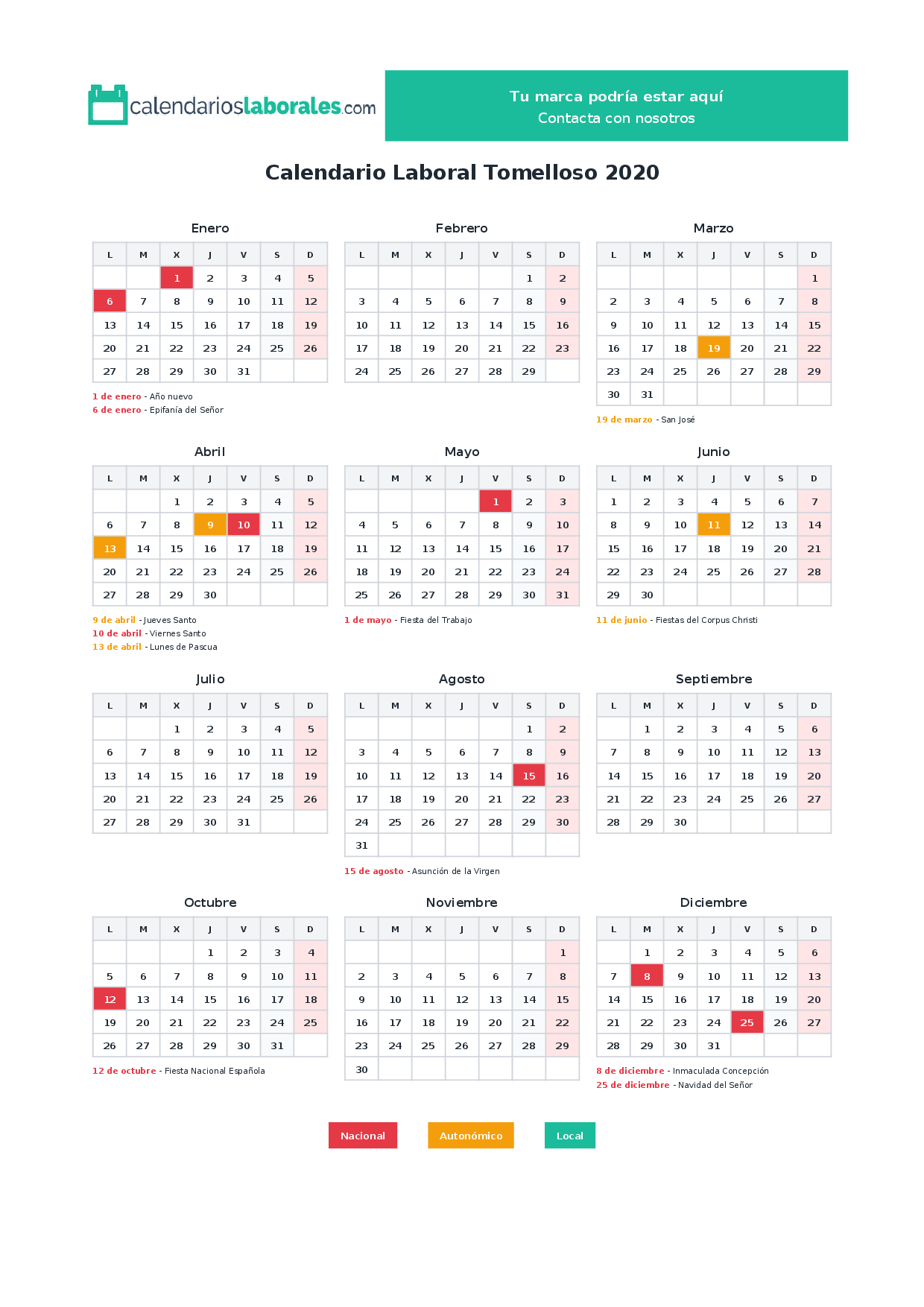 Calendario laboral Tomelloso 2020