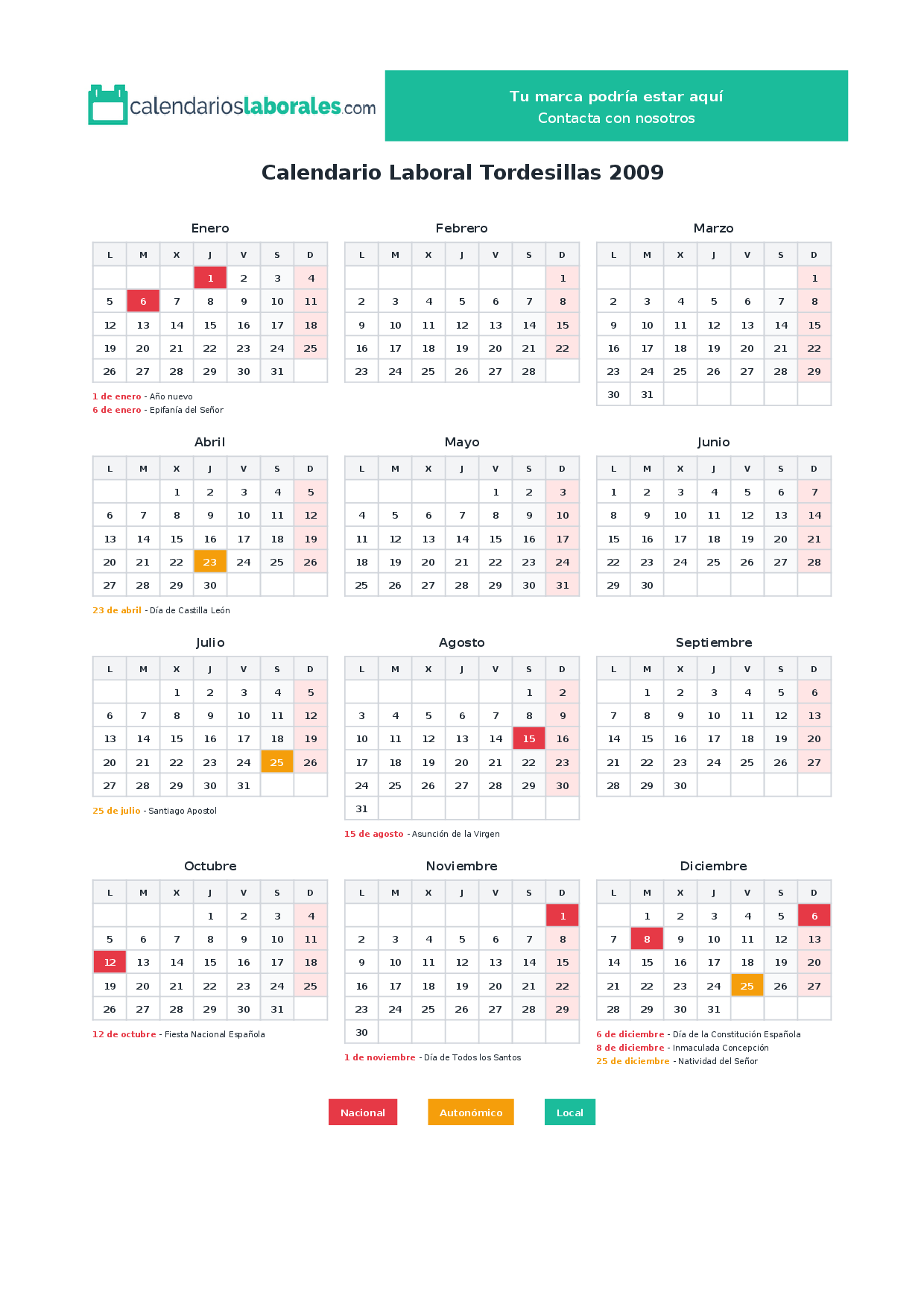 En 2009, 7 festivos nacionales se celebran en todo el territorio español, incluidos en el calendario laboral de Tordesillas.