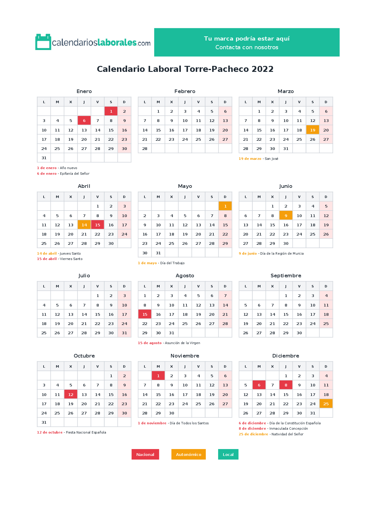 El calendario laboral de Torre-Pacheco en 2022 incluye un total de 13 días festivos, que combinan festivos nacionales, festivos autonómicos de Murcia y los festivos locales propios del municipio.