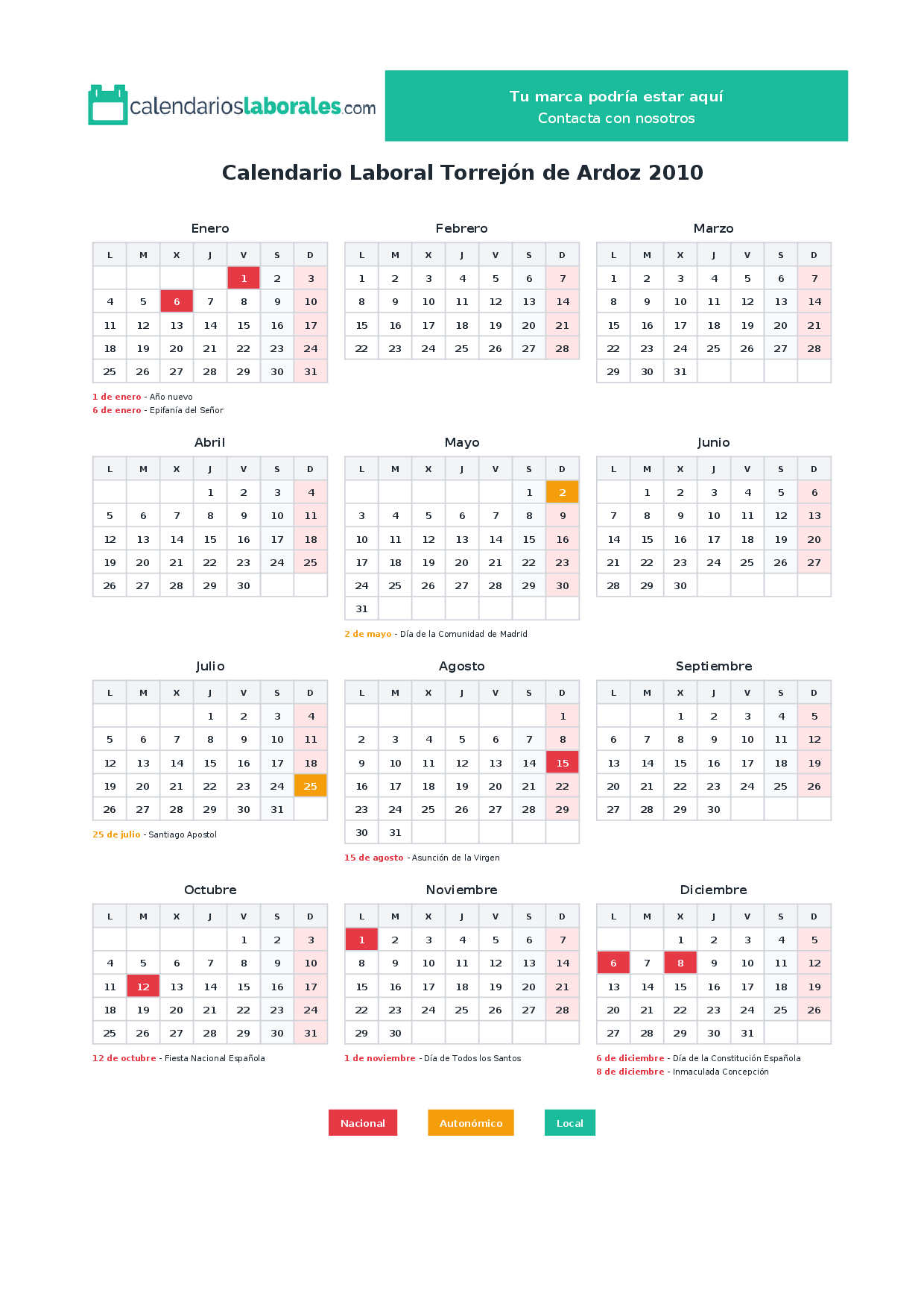 En 2010, 7 festivos nacionales se celebran en todo el territorio español, incluidos en el calendario laboral de Torrejón de Ardoz.