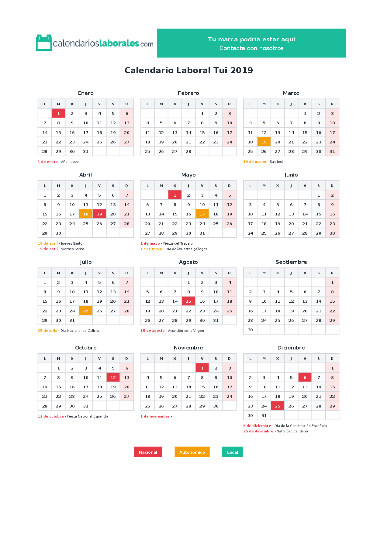 El calendario laboral de Tui en 2019 incluye un total de 12 días festivos, que combinan festivos nacionales, festivos autonómicos de Galicia y los festivos locales propios del municipio.