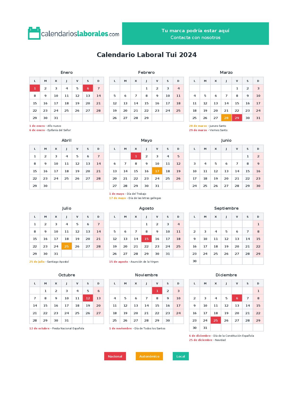El calendario laboral de Tui en 2024 incluye un total de 12 días festivos, que combinan festivos nacionales, festivos autonómicos de Galicia y los festivos locales propios del municipio.