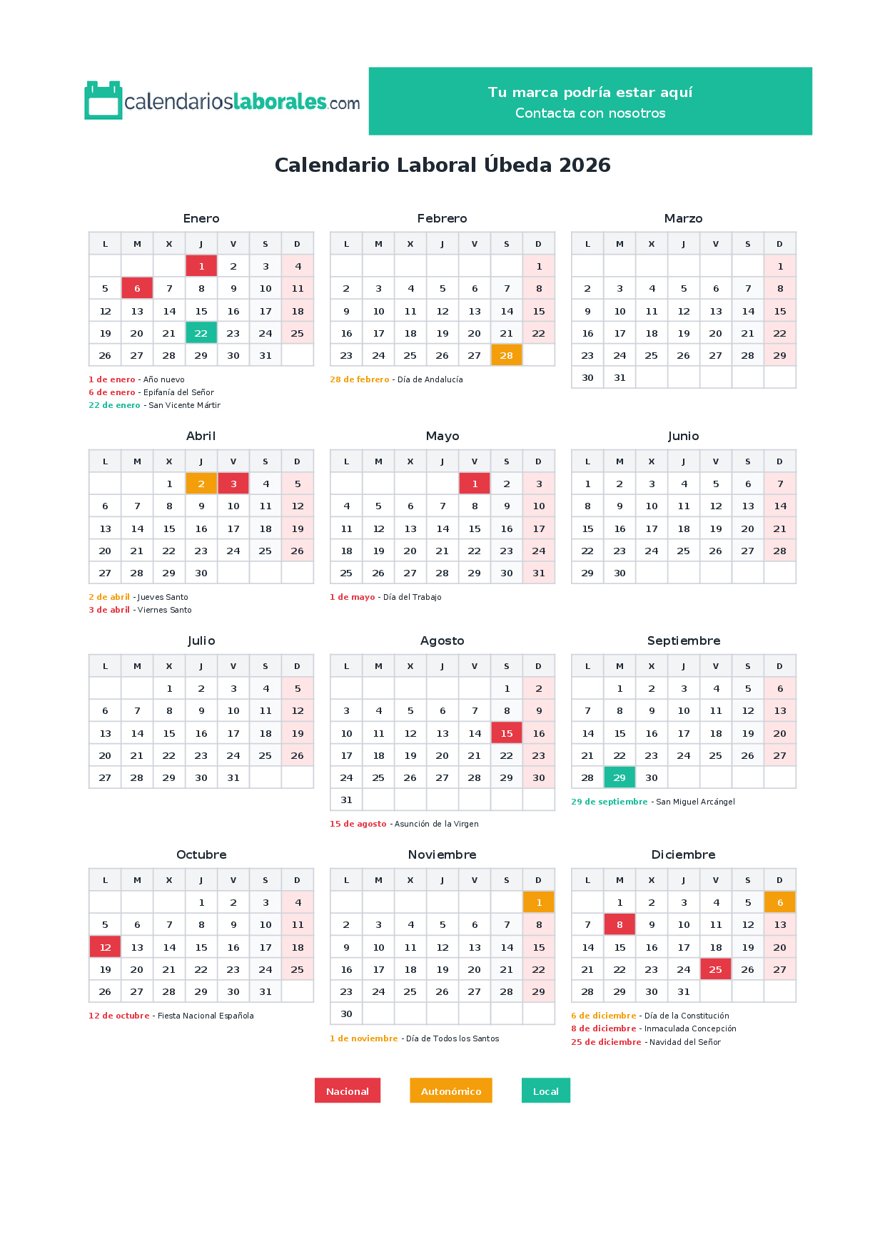 El calendario laboral de Úbeda en 2026 incluye un total de 14 días festivos, que combinan festivos nacionales, festivos autonómicos de Andalucía y los festivos locales propios del municipio.