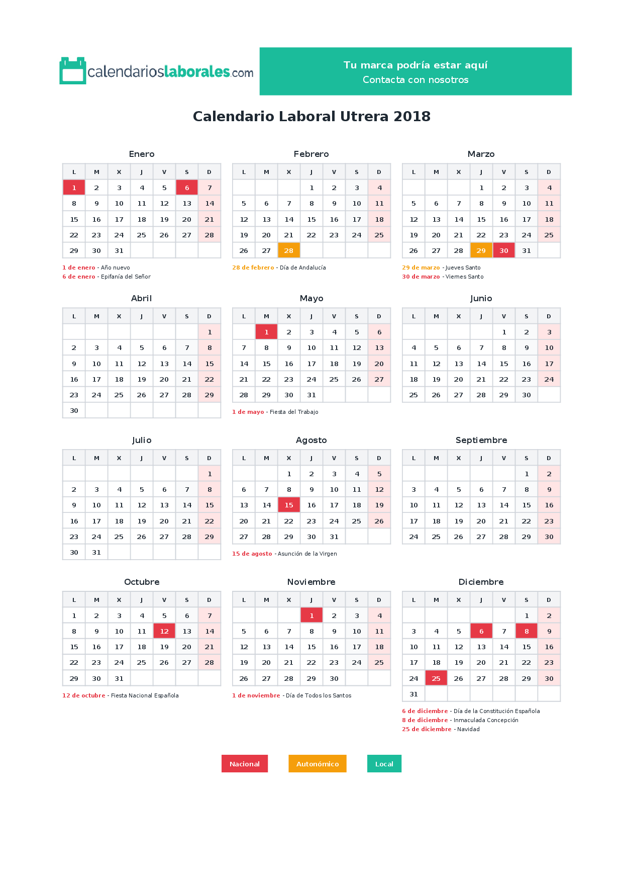 El calendario laboral de Utrera en 2018 incluye un total de 12 días festivos, que combinan festivos nacionales, festivos autonómicos de Andalucía y los festivos locales propios del municipio.