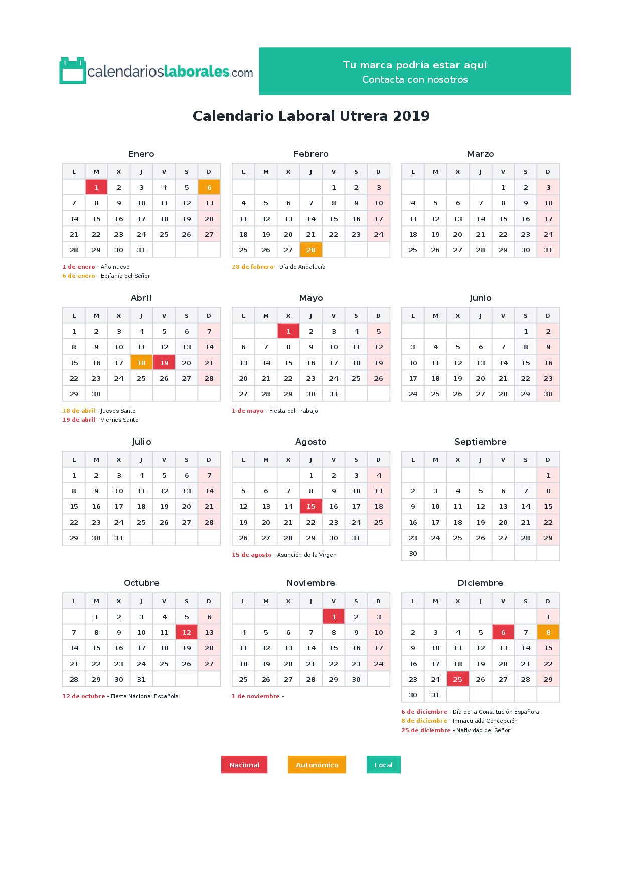 El calendario laboral de Utrera en 2019 incluye un total de 12 días festivos, que combinan festivos nacionales, festivos autonómicos de Andalucía y los festivos locales propios del municipio.