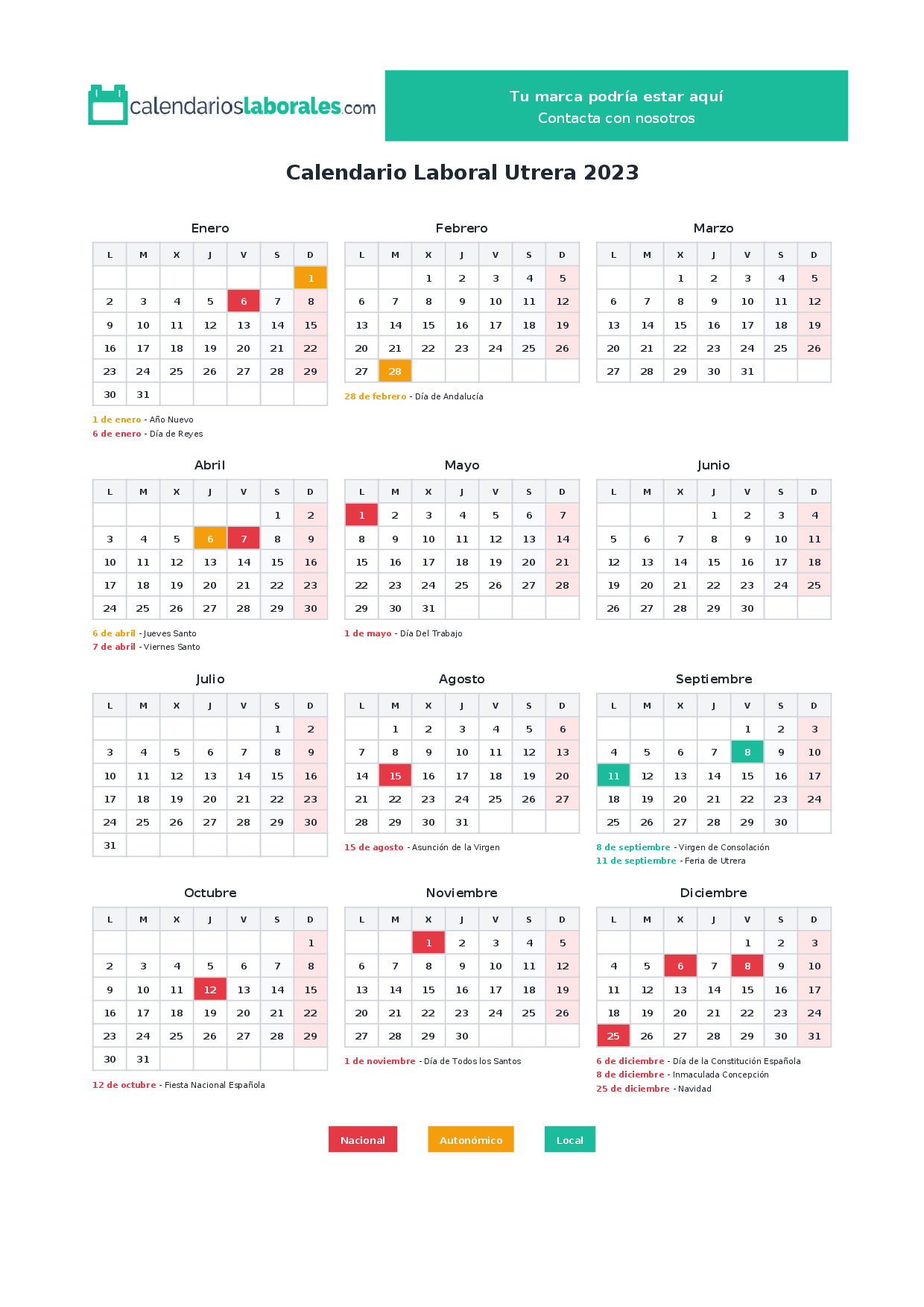 El calendario laboral de Utrera en 2023 incluye un total de 14 días festivos, que combinan festivos nacionales, festivos autonómicos de Andalucía y los festivos locales propios del municipio.