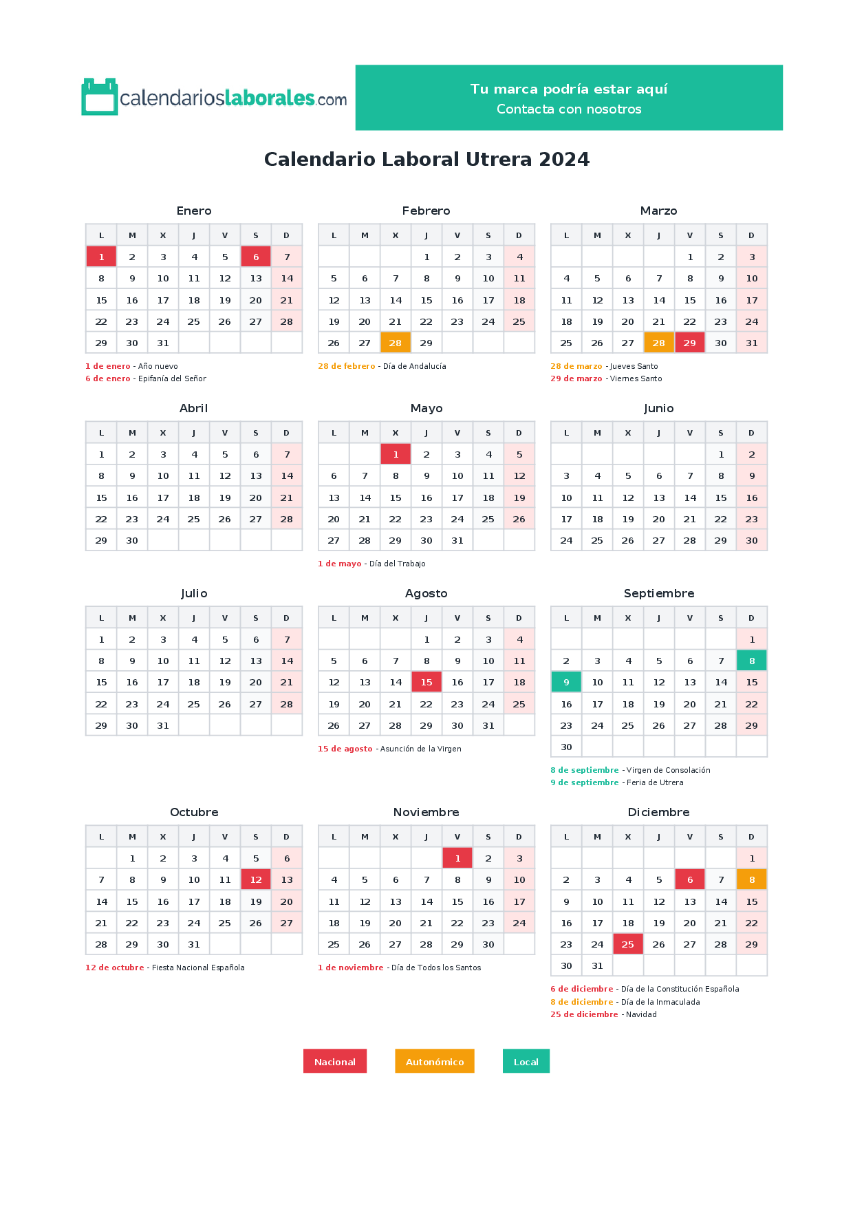 El calendario laboral de Utrera en 2024 incluye un total de 14 días festivos, que combinan festivos nacionales, festivos autonómicos de Andalucía y los festivos locales propios del municipio.