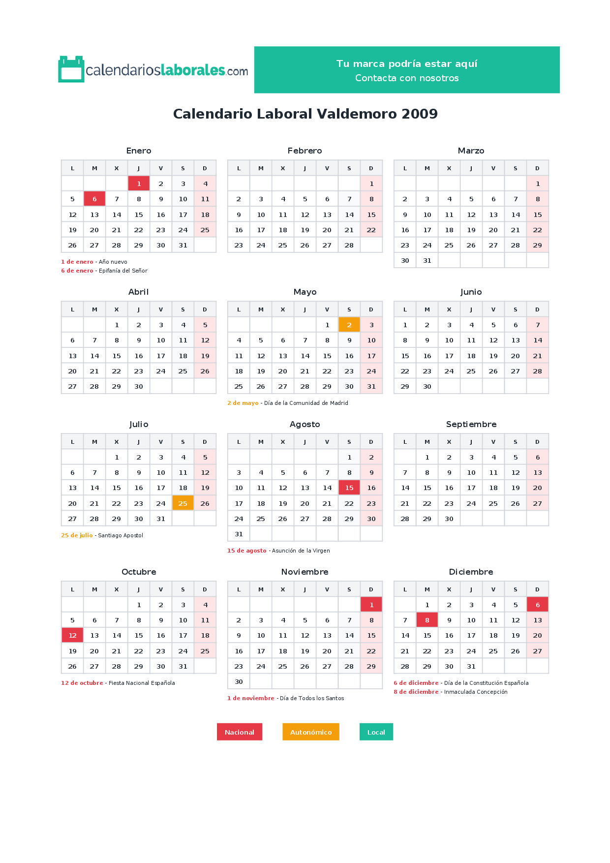 En 2009, 7 festivos nacionales se celebran en todo el territorio español, incluidos en el calendario laboral de Valdemoro.