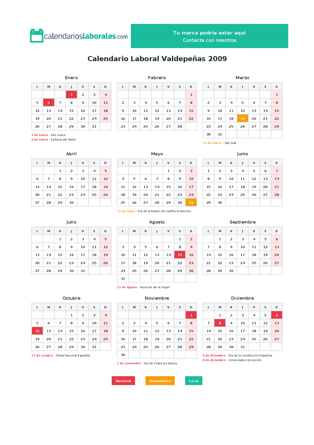 En 2009, 7 festivos nacionales se celebran en todo el territorio español, incluidos en el calendario laboral de Valdepeñas.