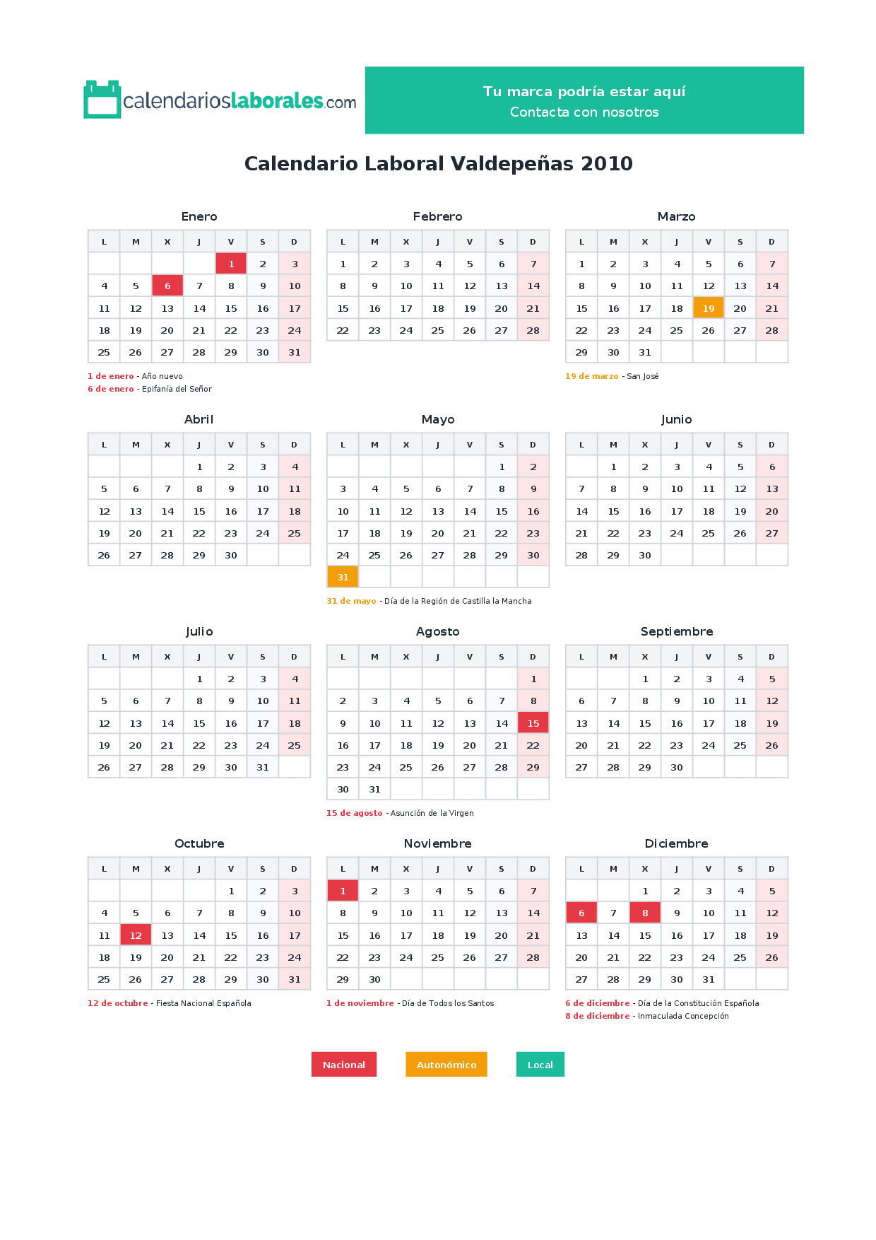 En 2010, 7 festivos nacionales se celebran en todo el territorio español, incluidos en el calendario laboral de Valdepeñas.