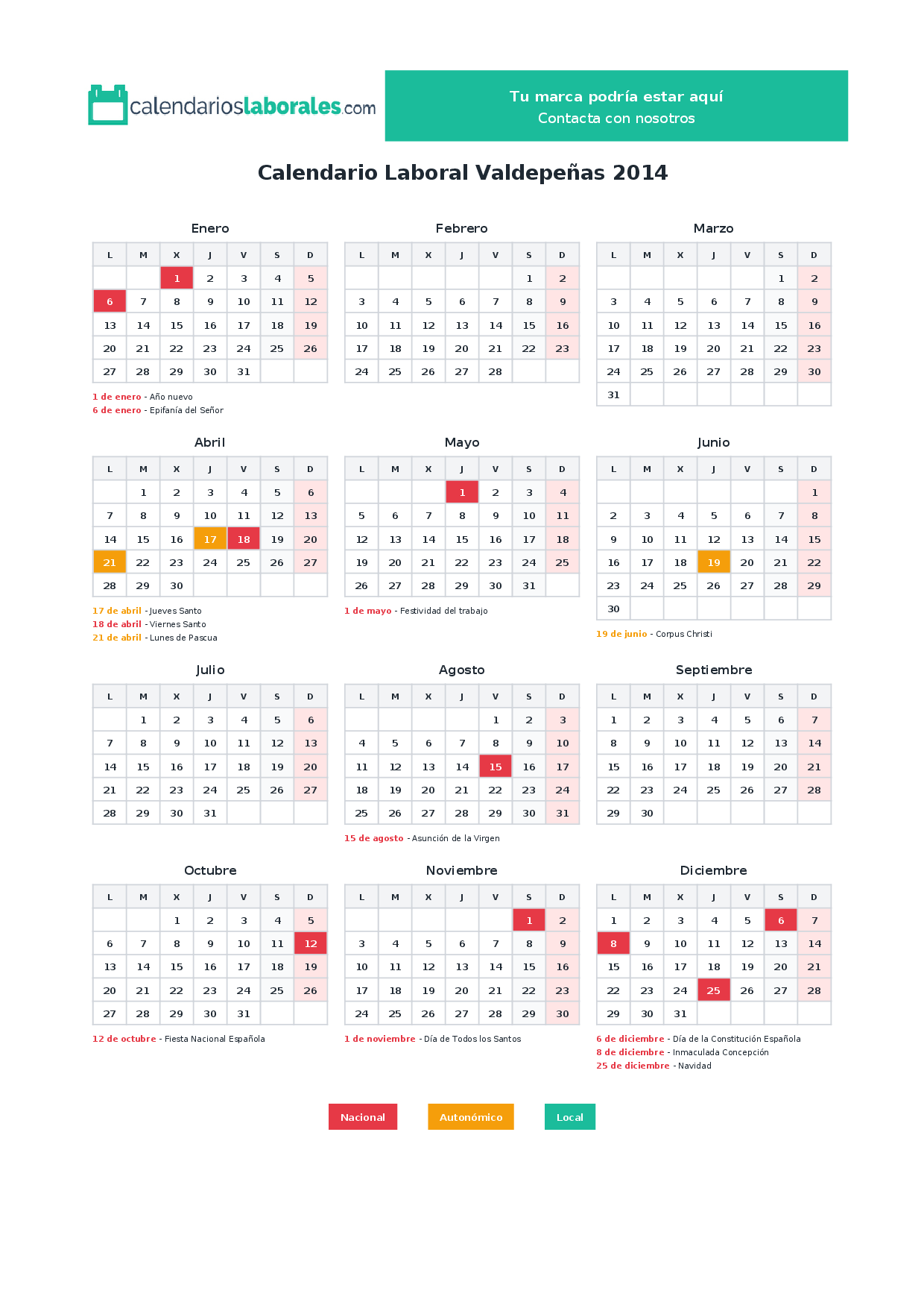 En 2014, 10 festivos nacionales se celebran en todo el territorio español, incluidos en el calendario laboral de Valdepeñas.