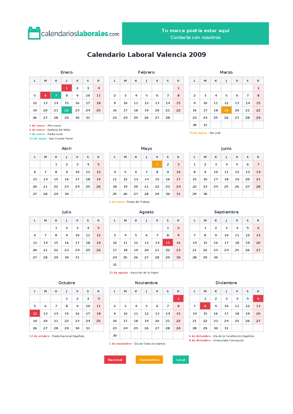 Puedes consultar también el calendario laboral completo de Comunidad Valenciana 2009 o el calendario laboral de España para conocer el detalle nacional.