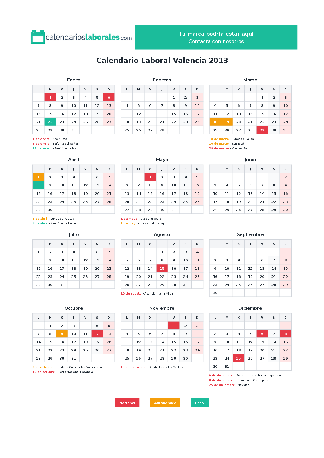 Puedes consultar también el calendario laboral completo de Comunidad Valenciana 2013 o el calendario laboral de España para conocer el detalle nacional.