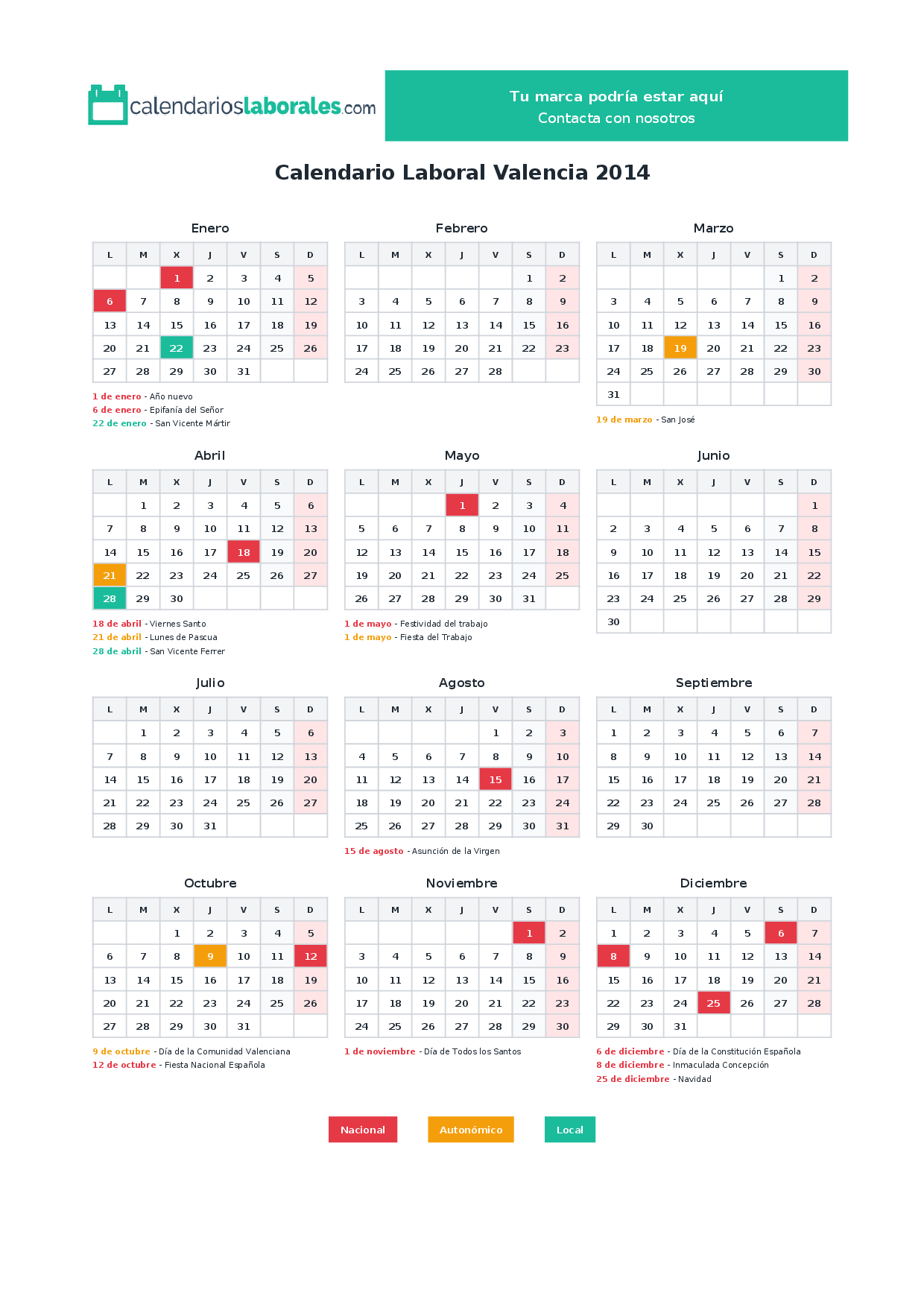 Puedes consultar también el calendario laboral completo de Comunidad Valenciana 2014 o el calendario laboral de España para conocer el detalle nacional.