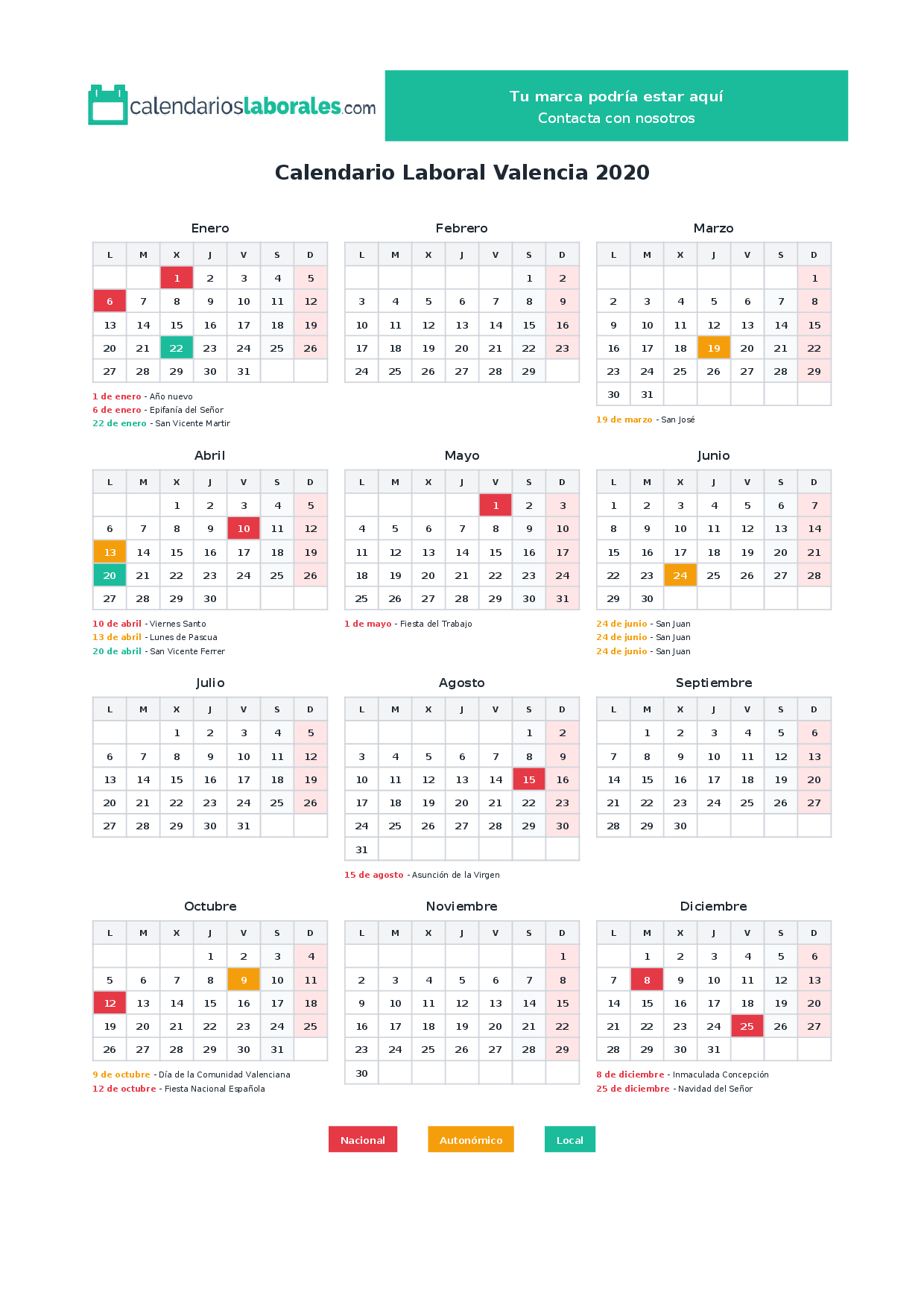 Puedes consultar también el calendario laboral completo de Comunidad Valenciana 2020 o el calendario laboral de España para conocer el detalle nacional.