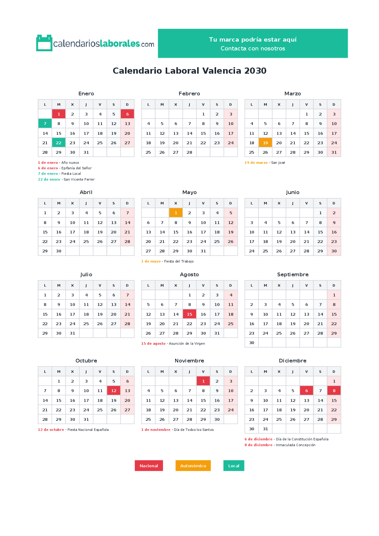 El calendario laboral de Valencia en 2030 cuenta con un total de 11 días festivos, que incluyen festivos nacionales, festivos autonómicos de Comunidad Valenciana y los festivos locales establecidos por cada municipio.