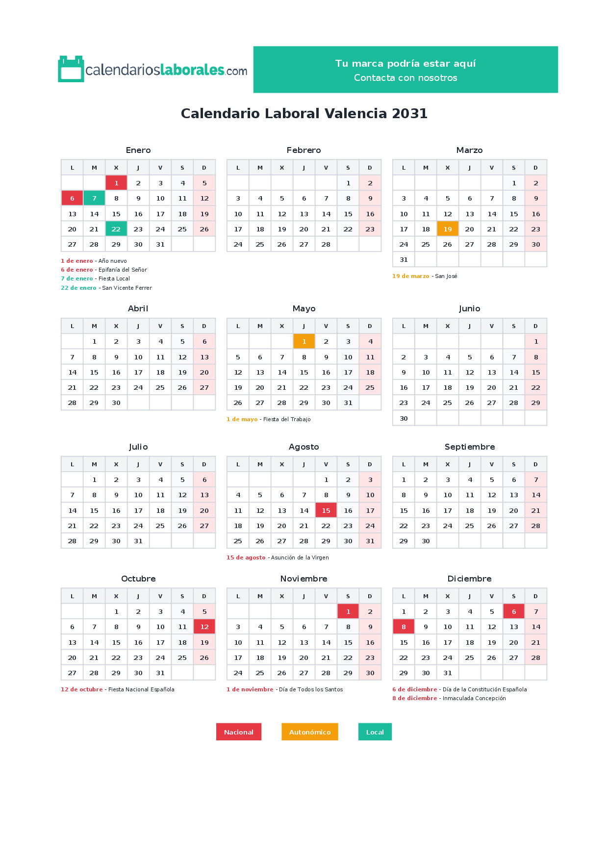 Calendario laboral Valencia 2031
