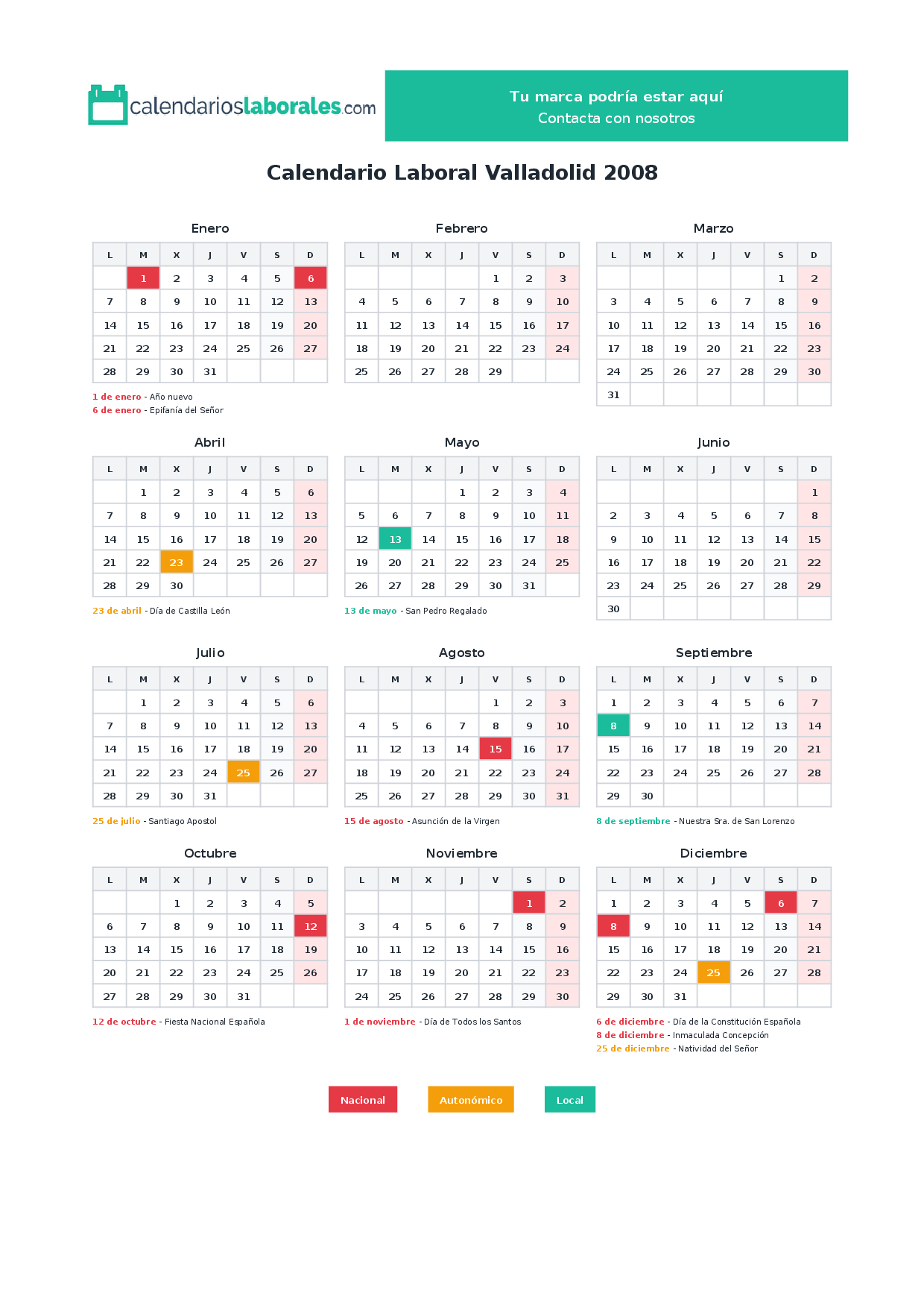 El calendario laboral de Valladolid en 2008 cuenta con un total de 12 días festivos, que incluyen festivos nacionales, festivos autonómicos de Castilla León y los festivos locales establecidos por cada municipio.