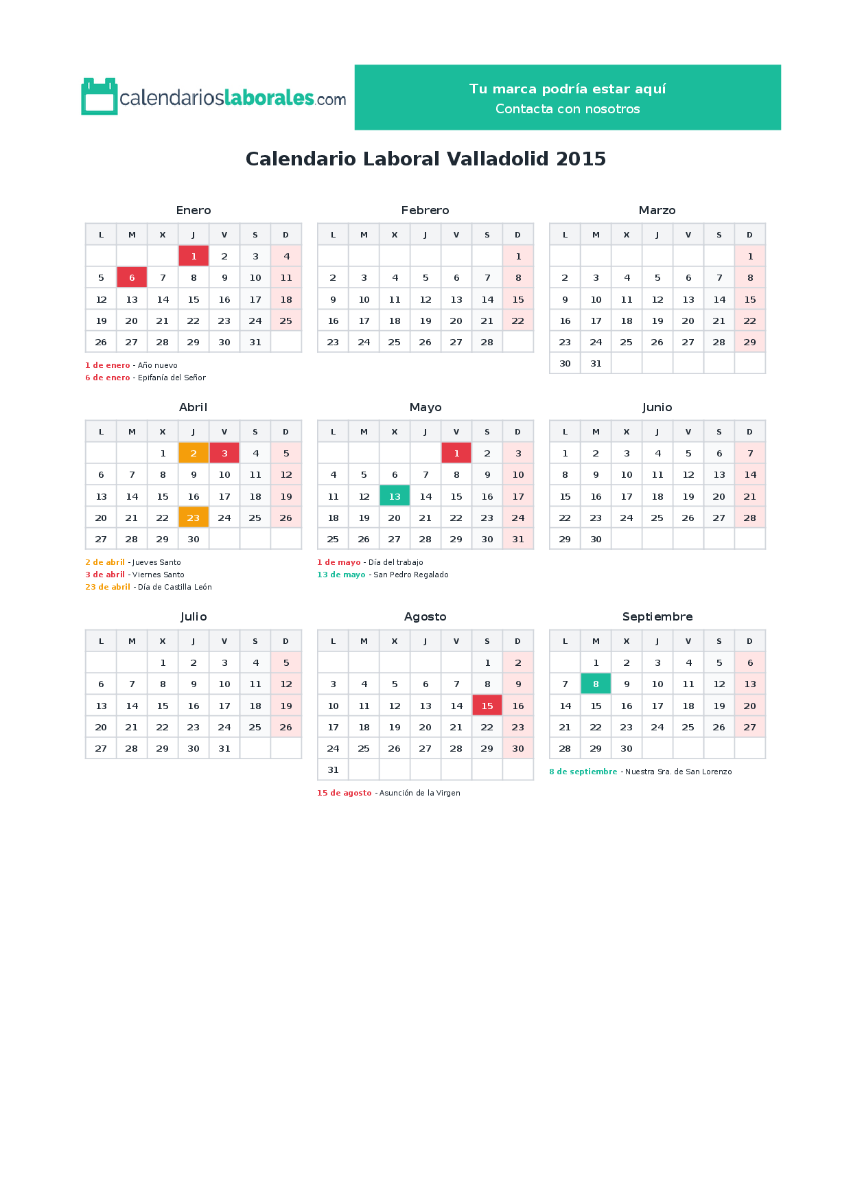 El calendario laboral de Valladolid en 2015 cuenta con un total de 14 días festivos, que incluyen festivos nacionales, festivos autonómicos de Castilla León y los festivos locales establecidos por cada municipio.