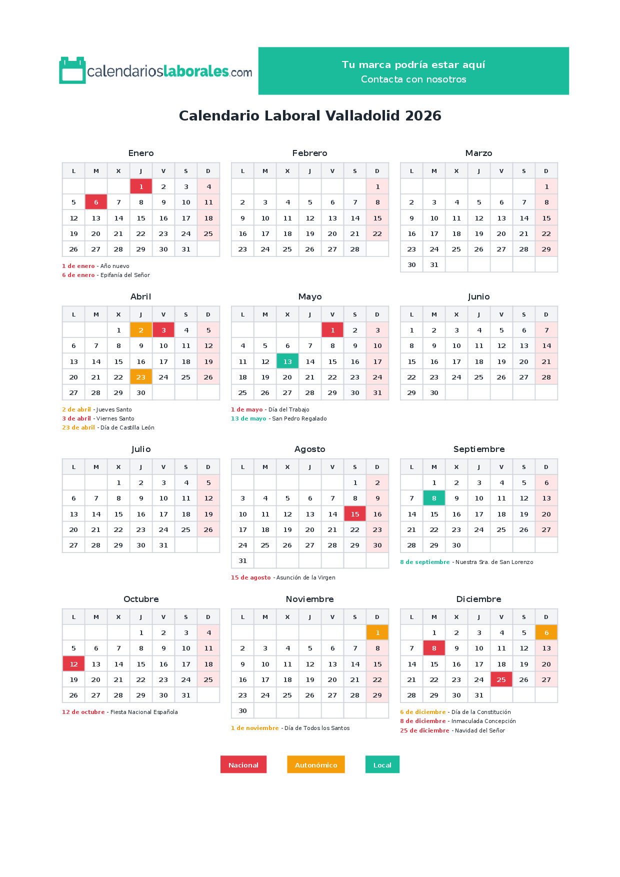 El calendario laboral de Valladolid en 2026 cuenta con un total de 14 días festivos, que incluyen festivos nacionales, festivos autonómicos de Castilla León y los festivos locales establecidos por cada municipio.