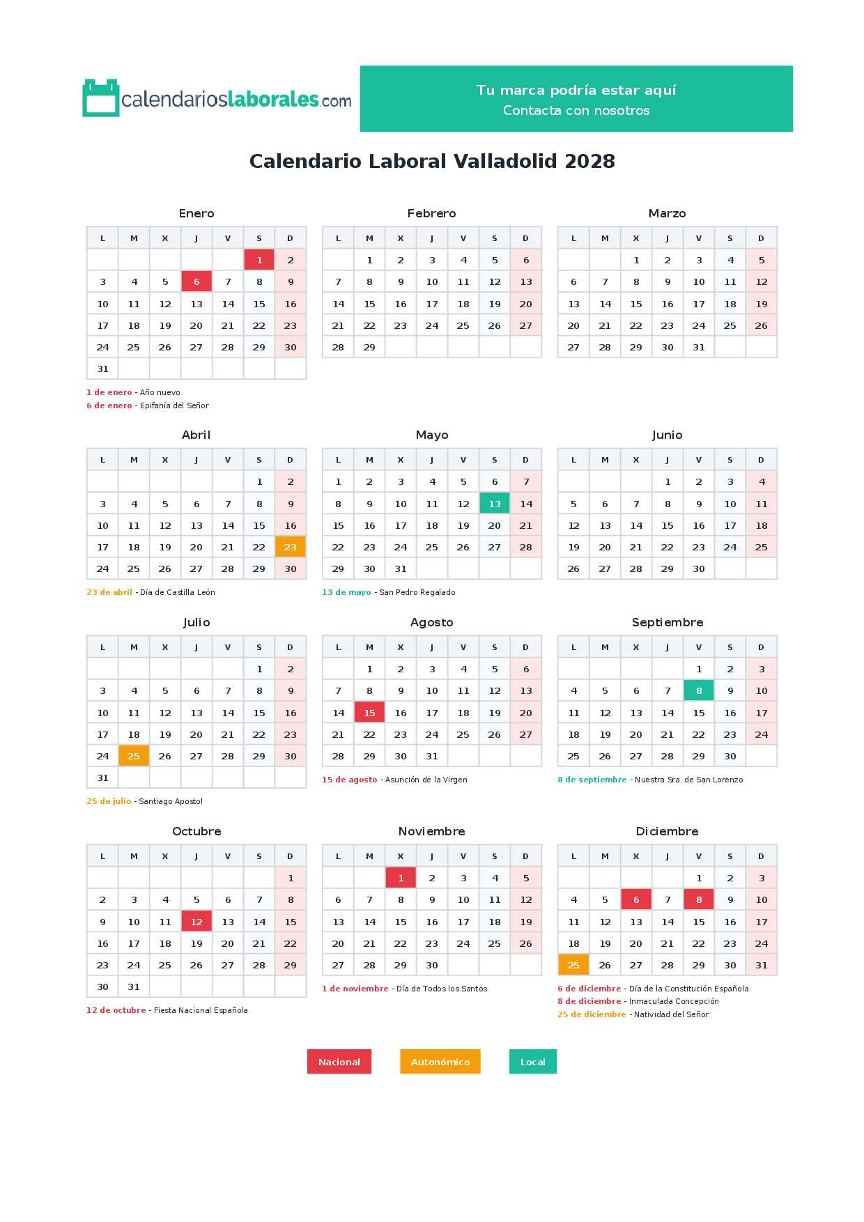 Calendario laboral Valladolid 2028